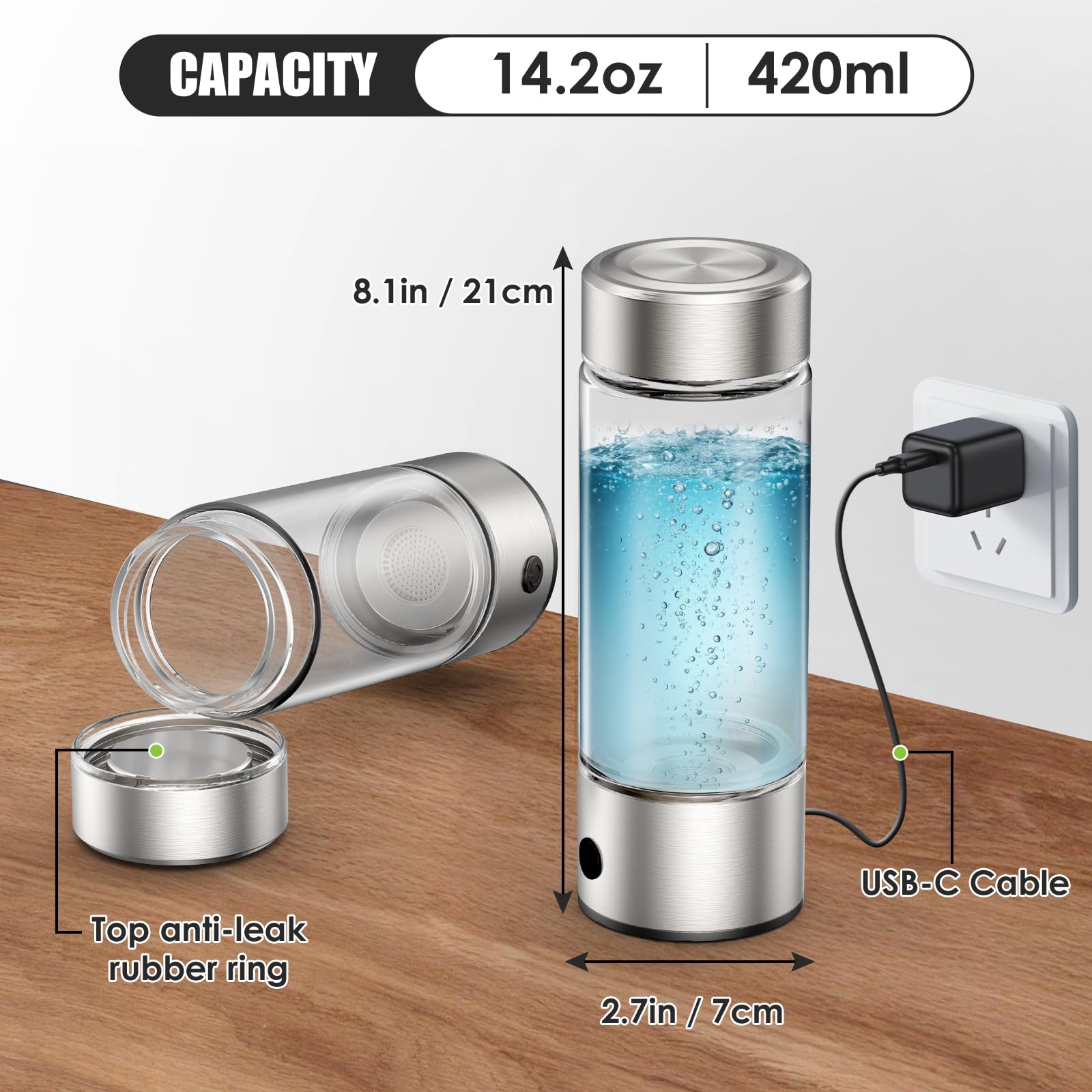 - Line With Food Grade Materials: Hydrogen water bottle is made of food grade borosilicate glass, the base is made of anti-slip, anti-seismic and wear-resistant silicone pad, and equipped with mineral water bottle adapter, hydrogen water bottle generator product is both safe and practical. 420ml large capacity, to provide you with more quality hydrogen water