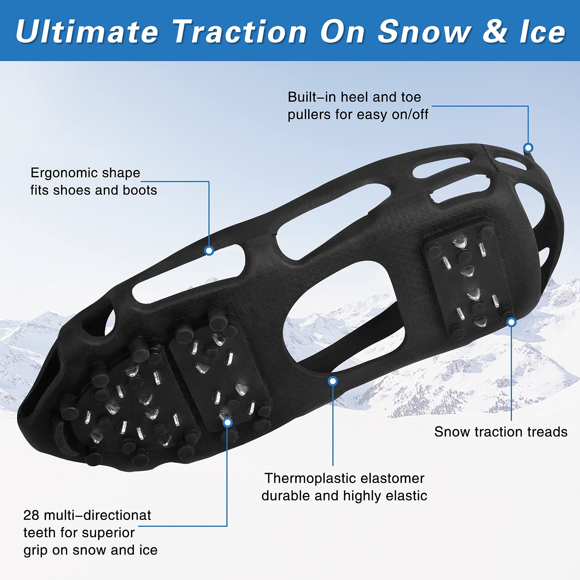 - 【SAFER DESIGN】Ice cleats for shoes and boots with 28 Updated stainless steel teeth firmly grasp the ground and provide ultimate traction,which is anti-slip and could prevent body injury on winter activities.It's your best companion walking on snow and ice.