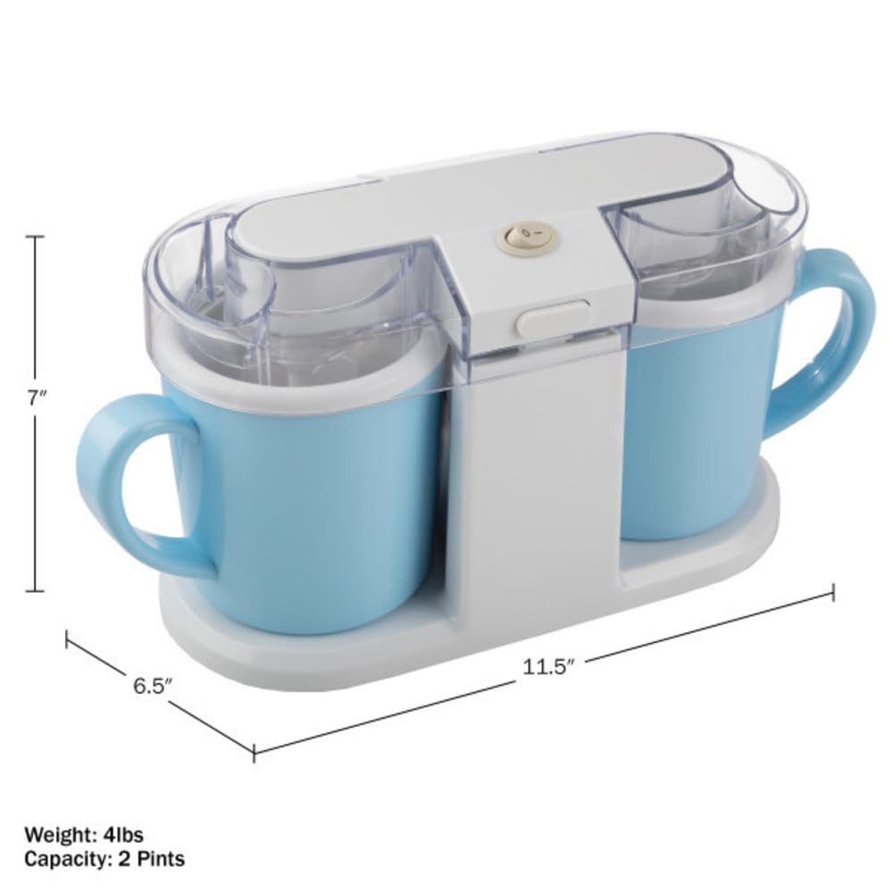 - PRODUCT DETAILS - Materials: PP and POM. Dimensions: (L) 11.5” x (W) 6.5” x (H) 7”. Weight: 4lbs. 1-Quart Capacity. ETL-Listed. Includes Machine, 2 Paddles, 2 Freezer Bowls, and Recipe Book. Color: Blue.