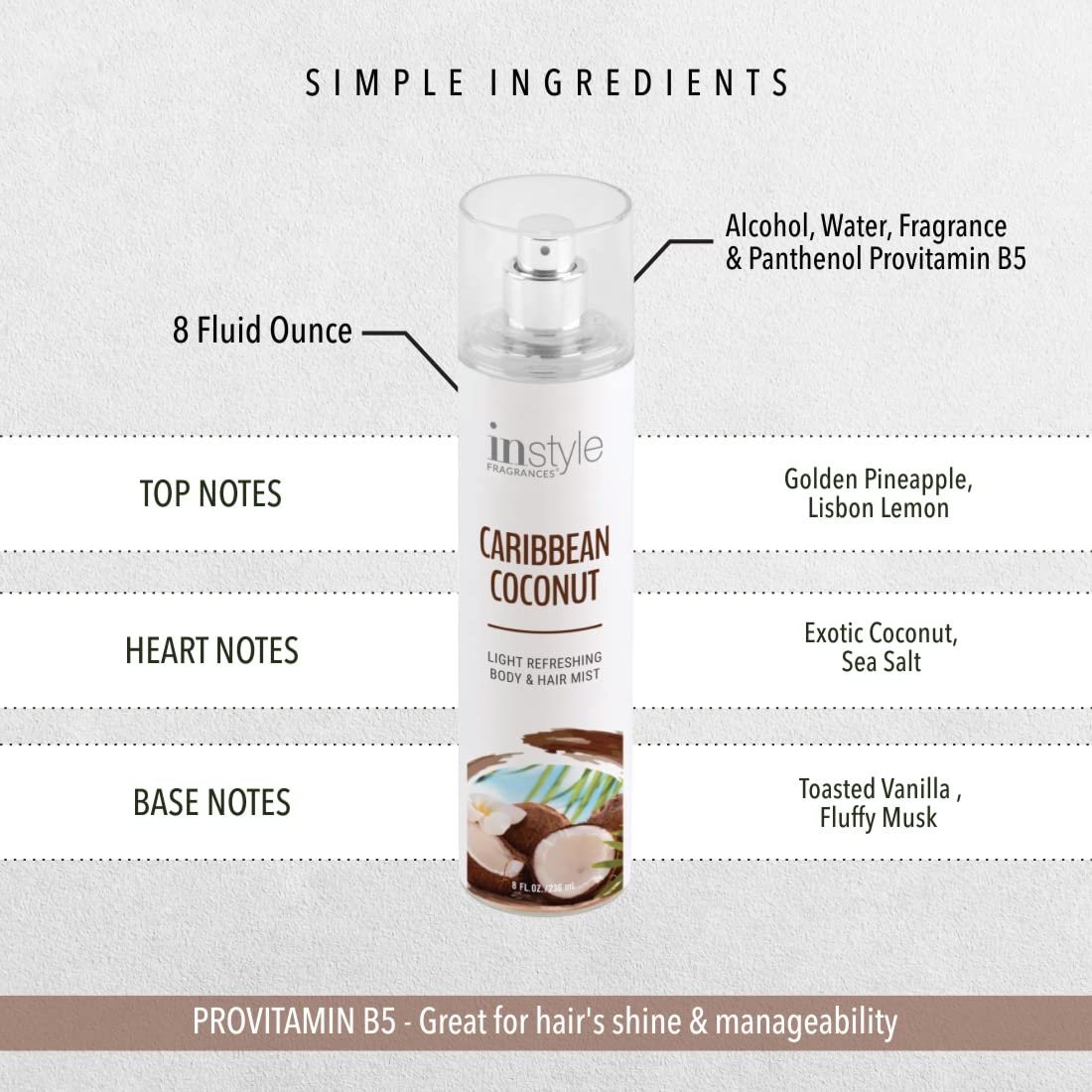 Instyle Fragrances | Body & Hair Mist | Caribbean Coconut Scent | With Panthenol | CLEAN, Vegan, Paraben Free, Phthalate Free | Premium 8 Fl Oz Spray Bottle