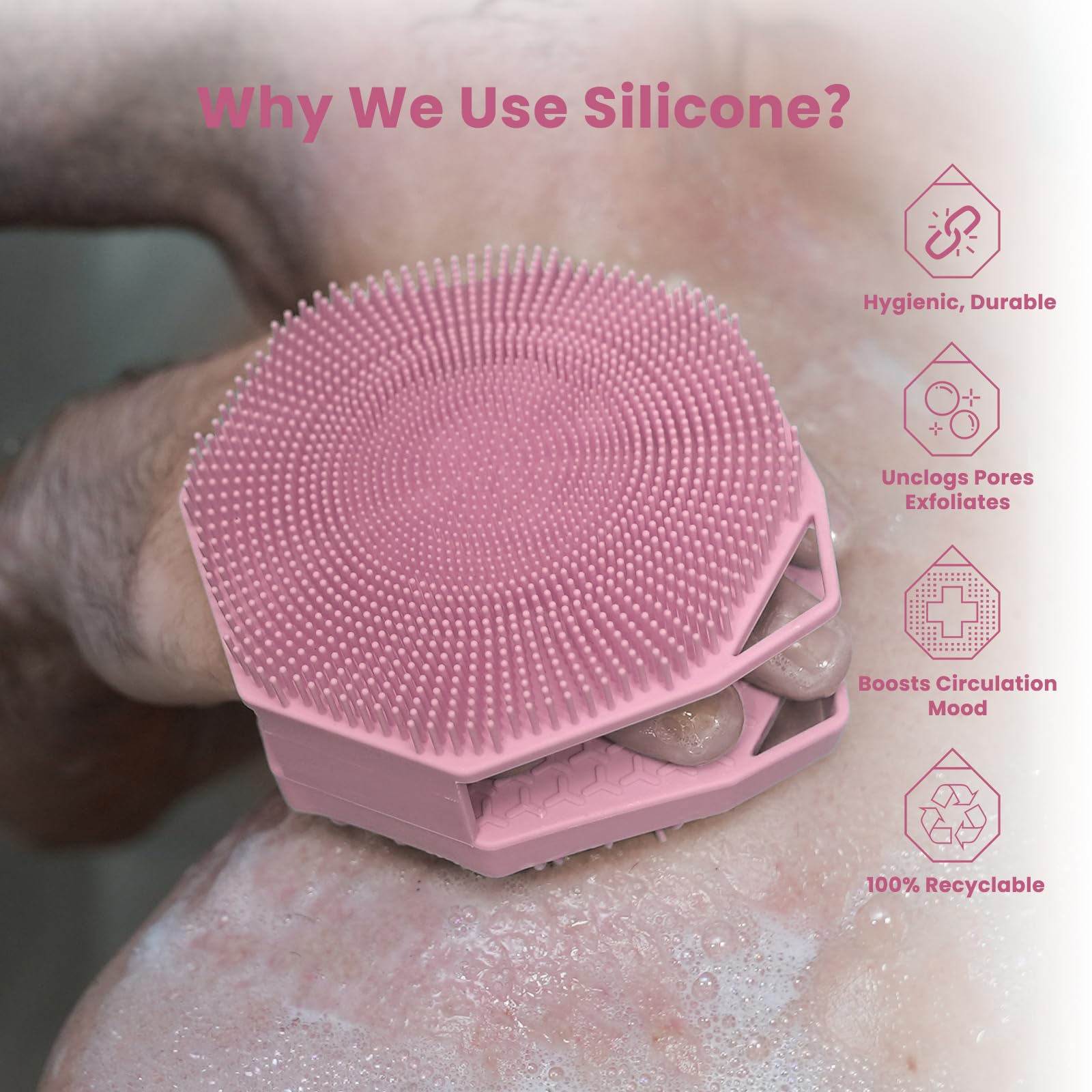 iTokGoK® Premium Silver-Infused Double-Sided Design 2-in-1 Silicone Body Scrubber for Women,Body Buffer Scrubber for Sensitive Skin, Ergonomic No-Slip Handle, Long-Lasting & Easy to Clean - Pink