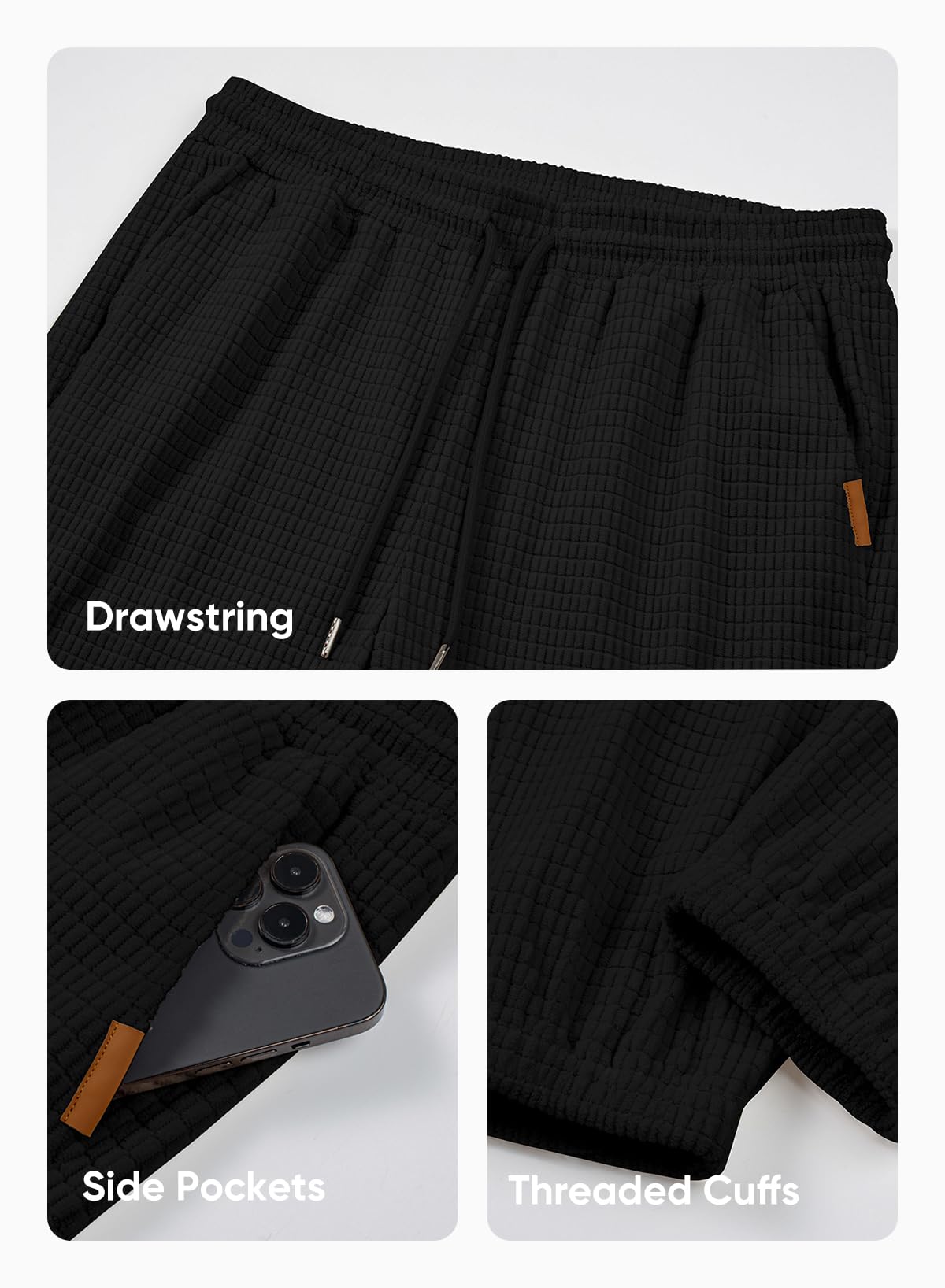 - Product Features: Experience ultimate comfort with our lightweight and breathable waffle sweatpants. The elastic waistband and cuffs provide exceptional flexibility and a snug fit. The stylish waffle material adds a touch of sophistication to your casual wardrobe.