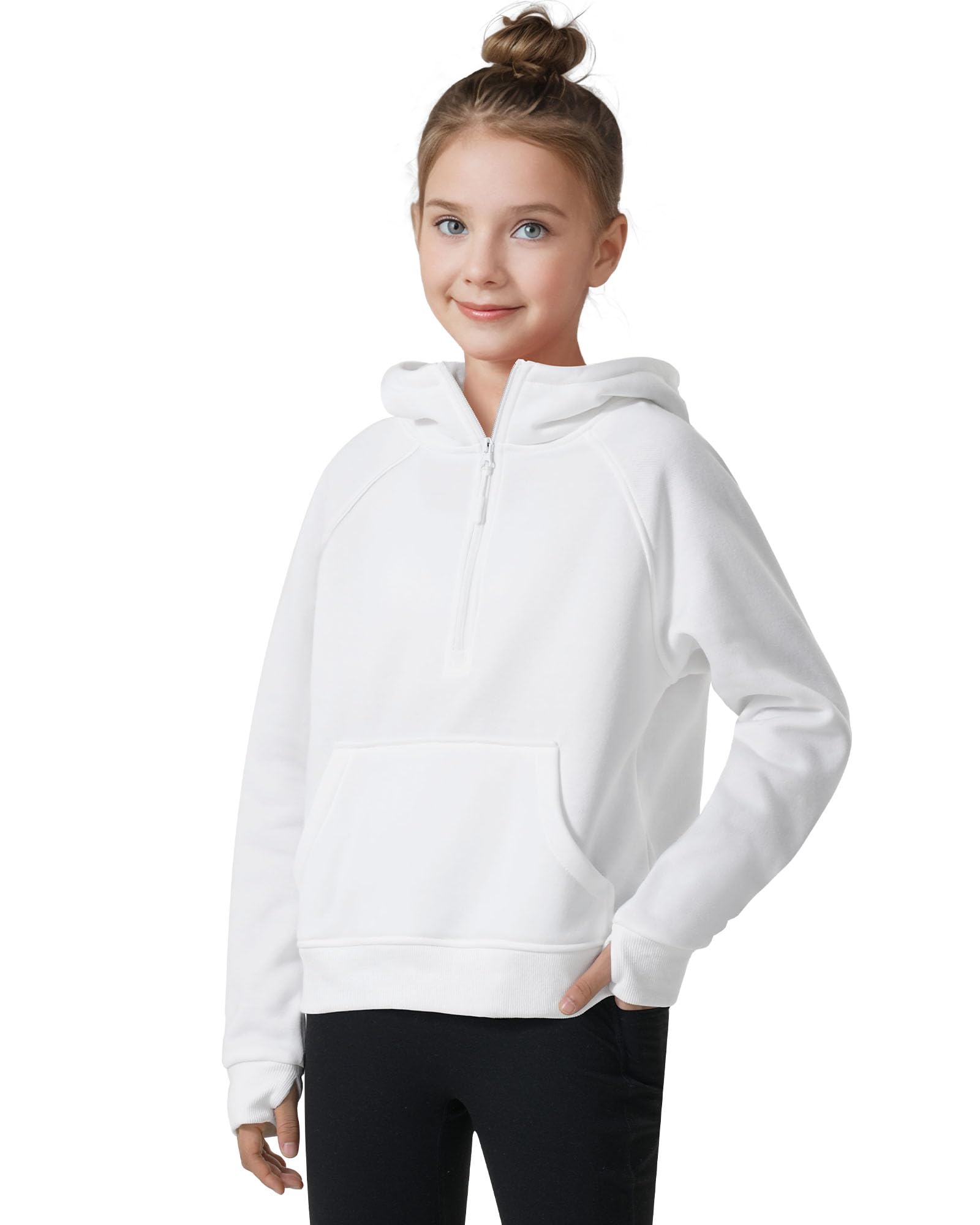 JOCMIC Girls Hoodies Half Zip Cropped Fleece Sweatshirts with Thumb Hole Kids Fall Winter Preppy Clothes White 13-14 Years