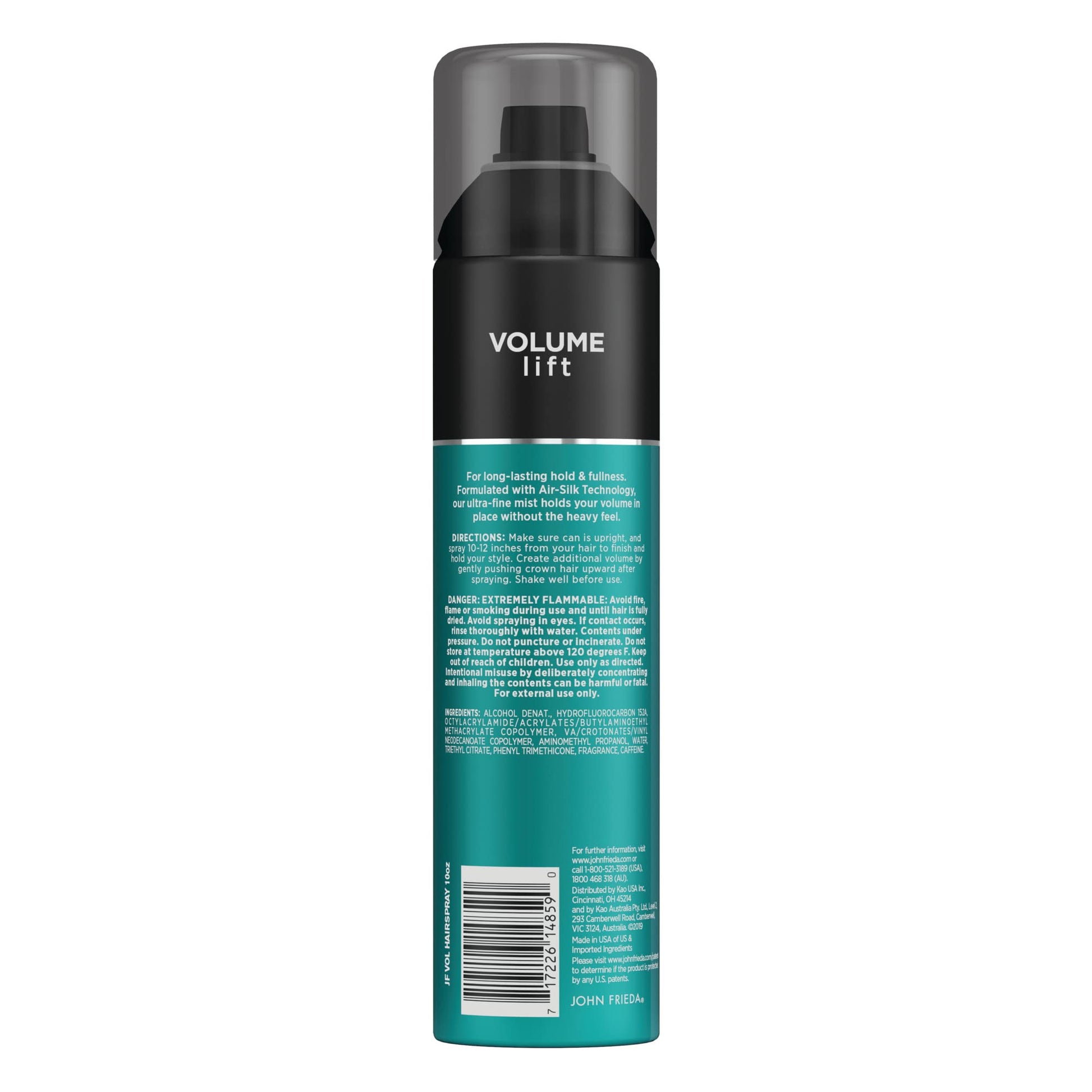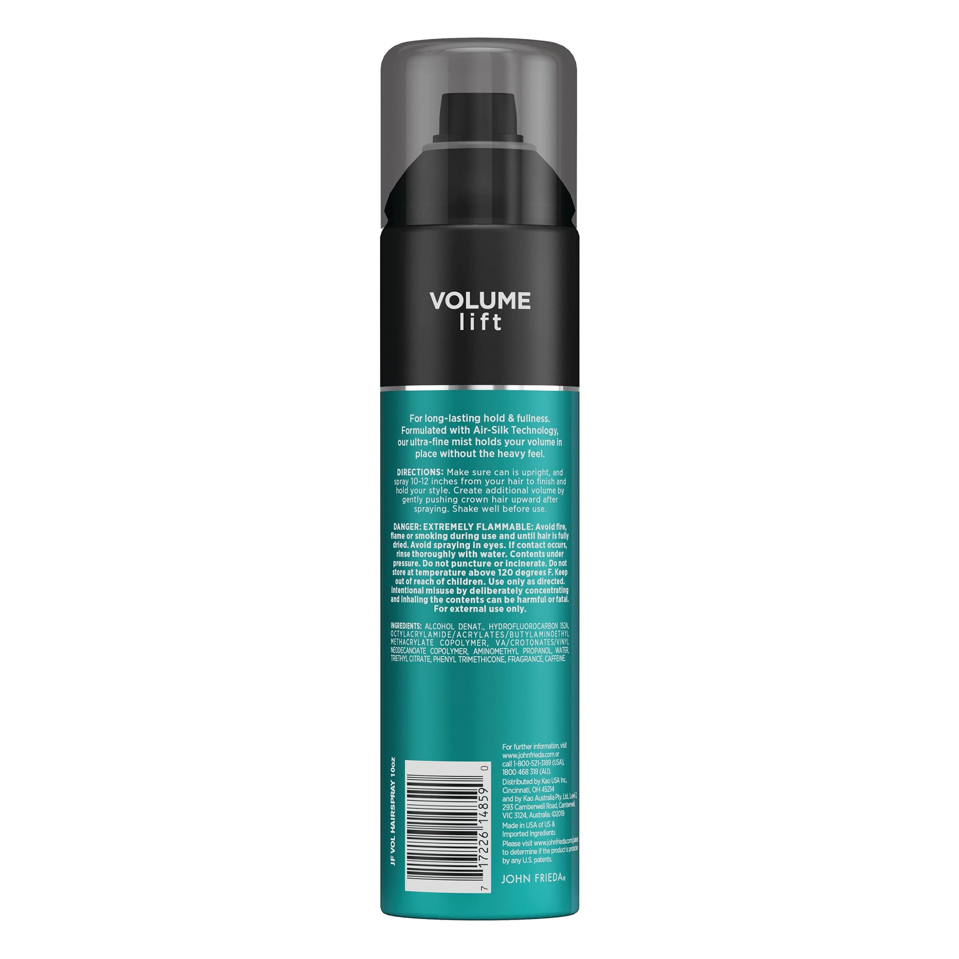 Details: John Frieda Volume Lift Hairspray for long-lasting hold & fullness. Formulated with Air-Silk Technology, our ultra-fine mist holds your volume in place without the heavy feel. Designed to provide more time for shaping your style, volume creation, and humidity resistance. Creates a gentle, fine mist for even, all over coverage that is easy to apply. Satisfaction Guaranteed. Limitations may apply.