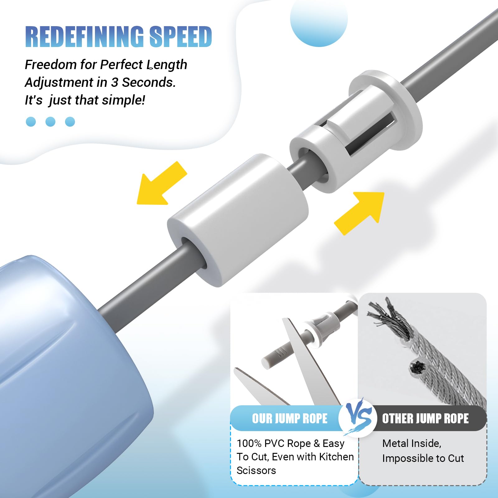 - [Impossible Jump Rope] Our adjustable jump rope feature the latest design, a combination of skin-friendly ABS handles and 100% PVC rope. Eliminates conventional ball bearings, which we have tested for over 1,000,000 rotations. The skipping rope not only extends the service life, but also achieves a quieter effect. Easy length adjustment in just 5 seconds. The jump rope can be easily adjusted and shared with your family even when you are outdoor.