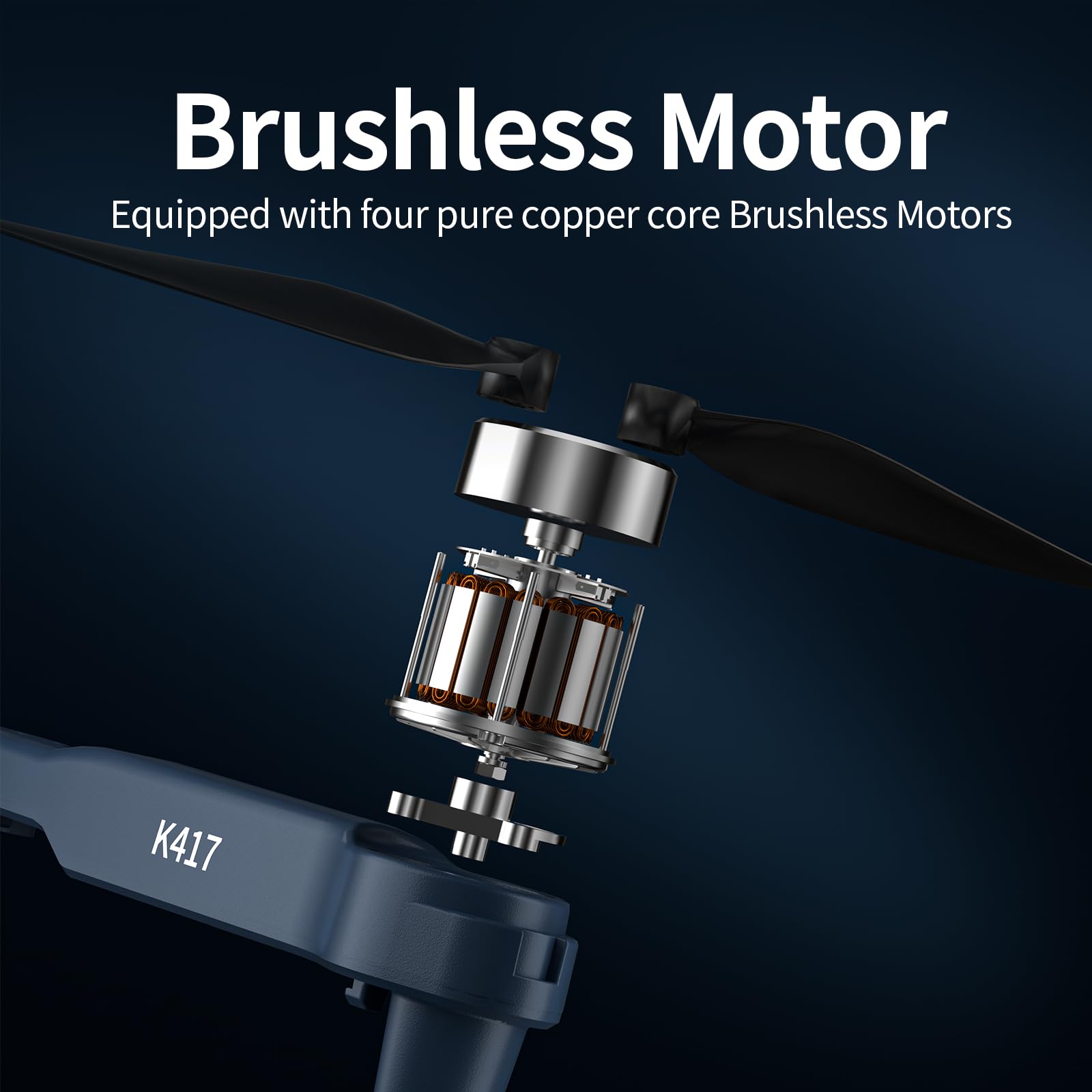 - K417 brushless motor Drone capable of reaching a max speed of 6000rpm. Brushless motors have no brushes, which leads to reduced friction and energy loss. They can respond to changes in torque more quickly, making them more efficient, easier to control, and have a longer lifespan. Brushless motors camera drone utilize high-quality magnets, coils and bearings, enabling it to maintain stable performance at high speeds and high loads, providing powerful thrust output and improved wind resistance.