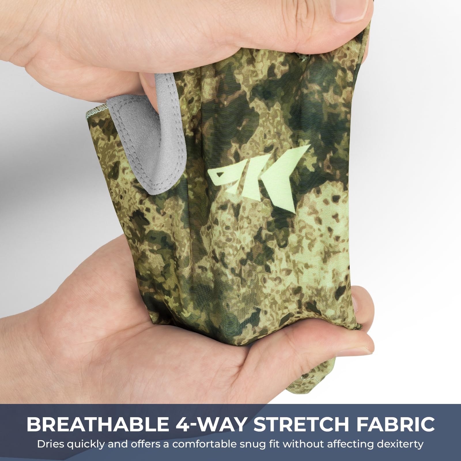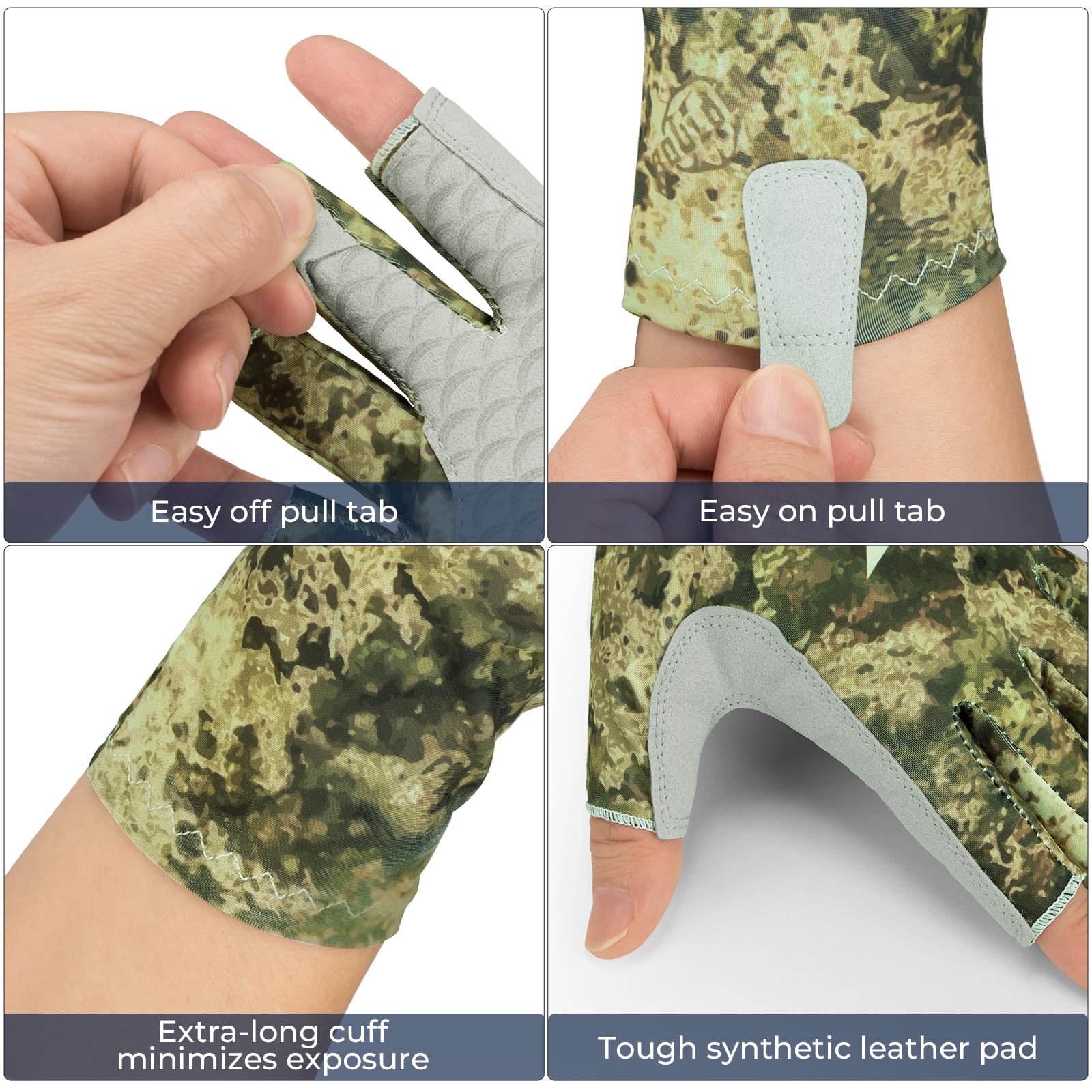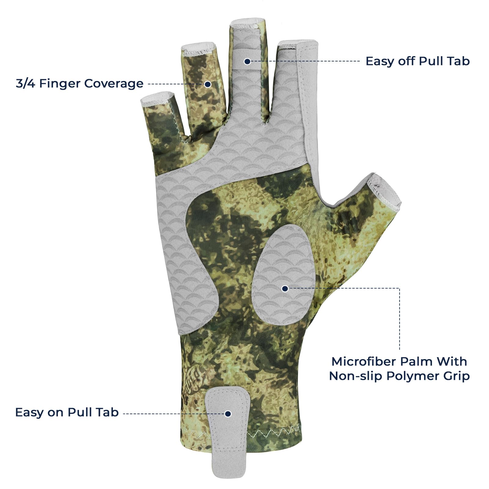 - *KEY FEATURES – UPF 50 UV protection fingerless fishing gloves for your hands – Breathable poly-spandex material – Re-enforced wear points – Integrated pull tabs – Fashionable Boulder colors by Prym1 Camo.