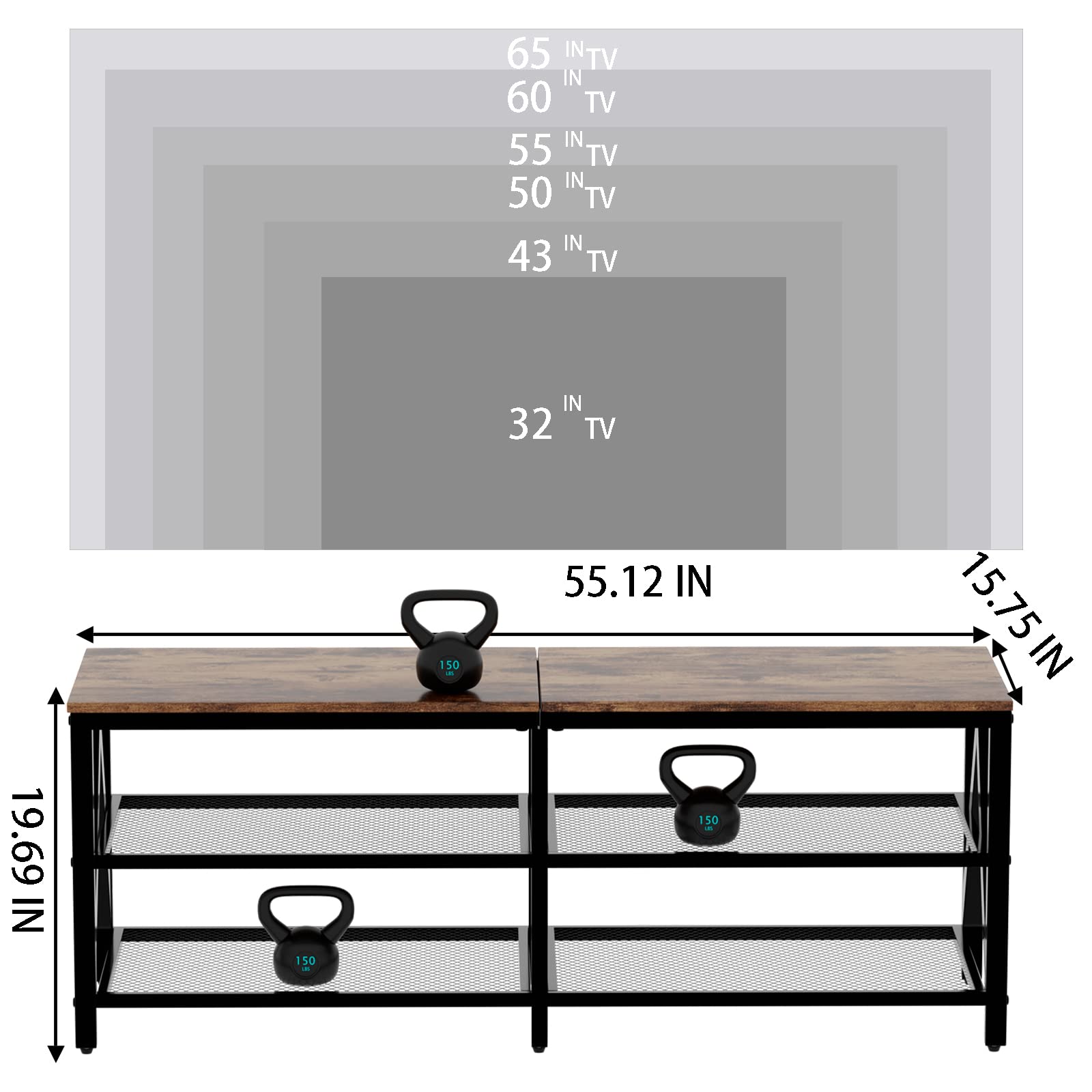 - The size of the TV stand is 55.12*15.75*19.69 '/140*40*50(length * width * height CM), suitable for 32-65 inch TV. Suitable for living rooms, bedrooms, etc. Weight capacity is 150 LBS. Two storeys of open space can hold more items, and the grid design can better ventilate and dissipate overheating of electronic products such as chassis or stereo.