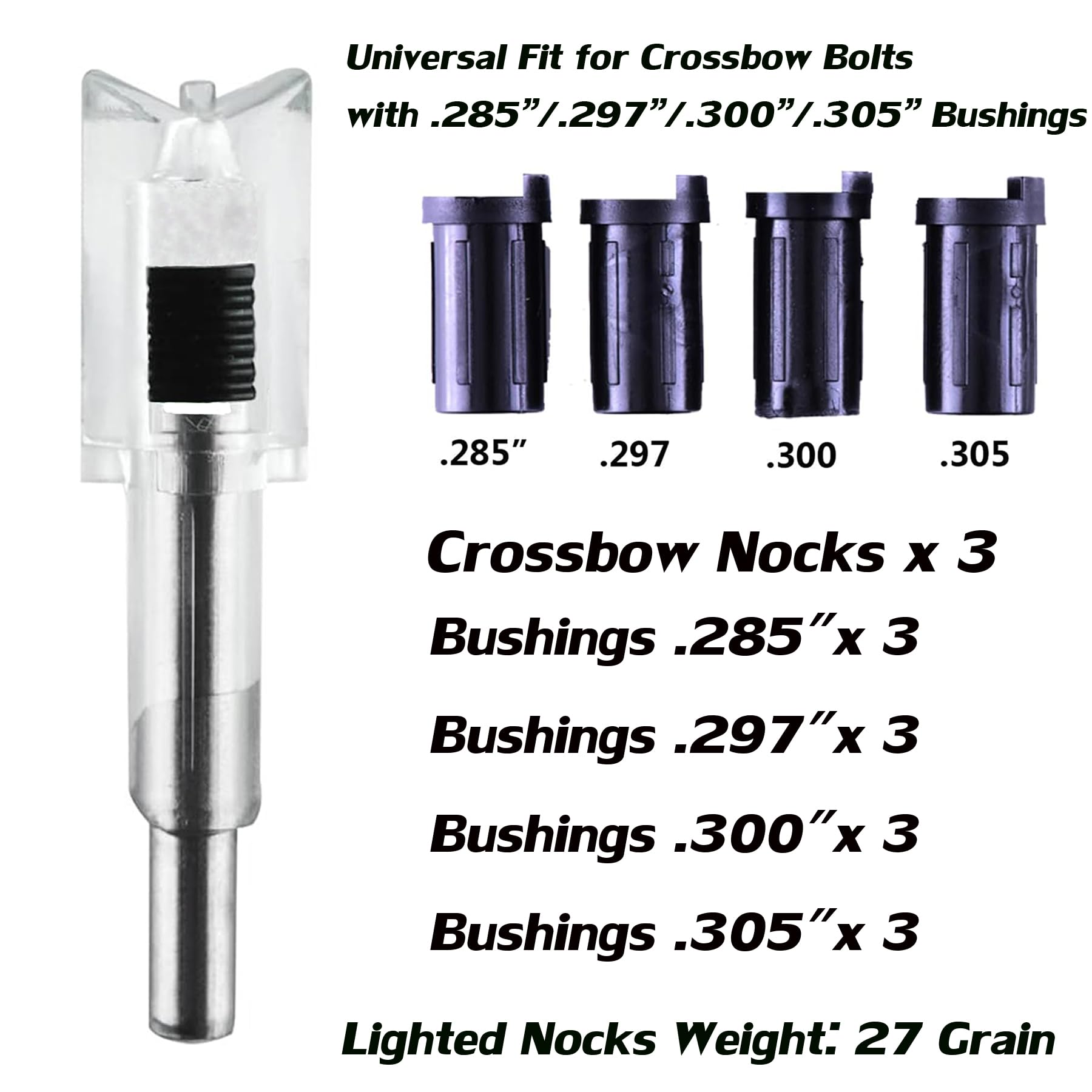 - 【Versatile Compatibility】: 204 Crossbow Lighted Nocks Universal for Bolts .285”/.297”/.300”/.305” With Each 3pcs of Bushings. Weight: About 26 Grain/Pcs.