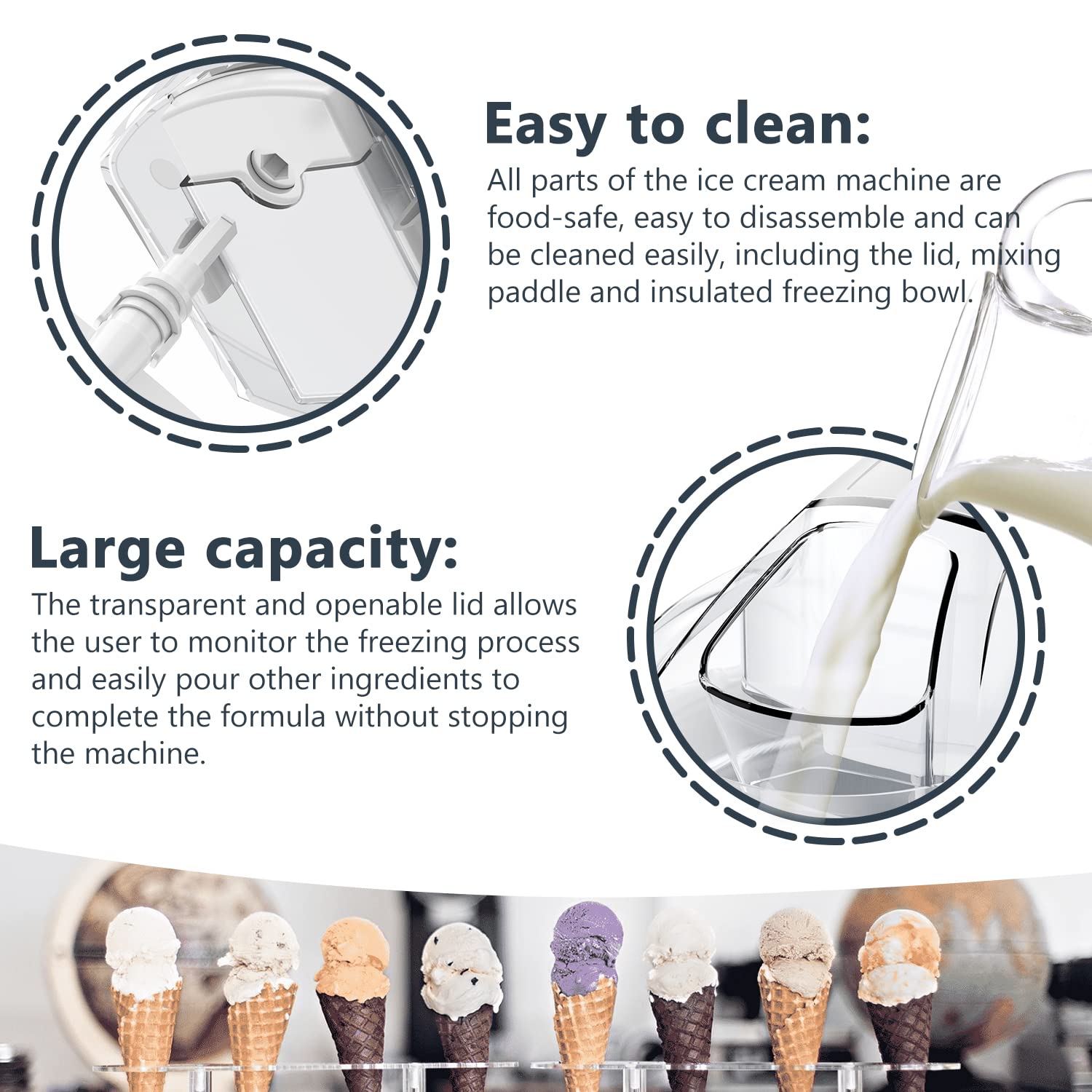 - Easy to clean: All parts of the ice cream machine are food-safe, easy to disassemble and can be cleaned easily, including the lid, mixing paddle and insulated freezing bowl.