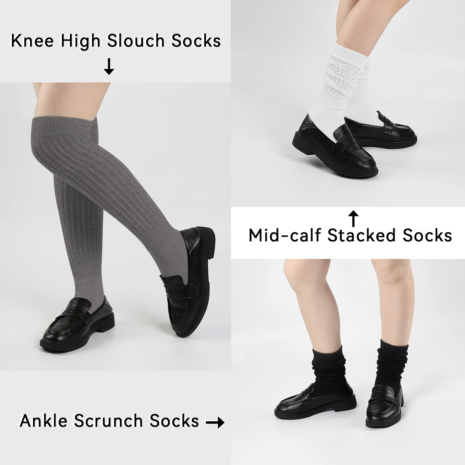 - Various Ways to Wear:Sufficient elasticity makes it possible to adjust the length of the socks at will.Scrunchie socks can be pulled to the knee as knee high socks, or shrunk to the ankle or mid-calf as scrunch socks and stacked socks.Meet your various wearing needs.