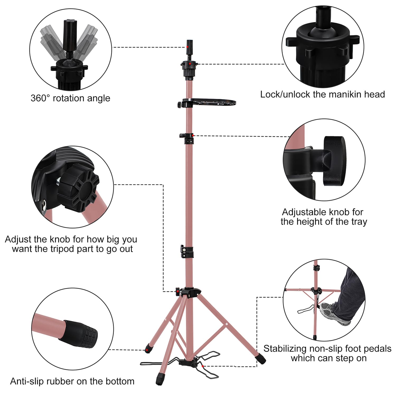 Klvied Metal Wig Stand Tripod with Foot Panel,Adjustable Mannequin Head Stand Tool Tray, Wig Head Stand for Styling,Tripod for Mannequin Head,Rose Golden