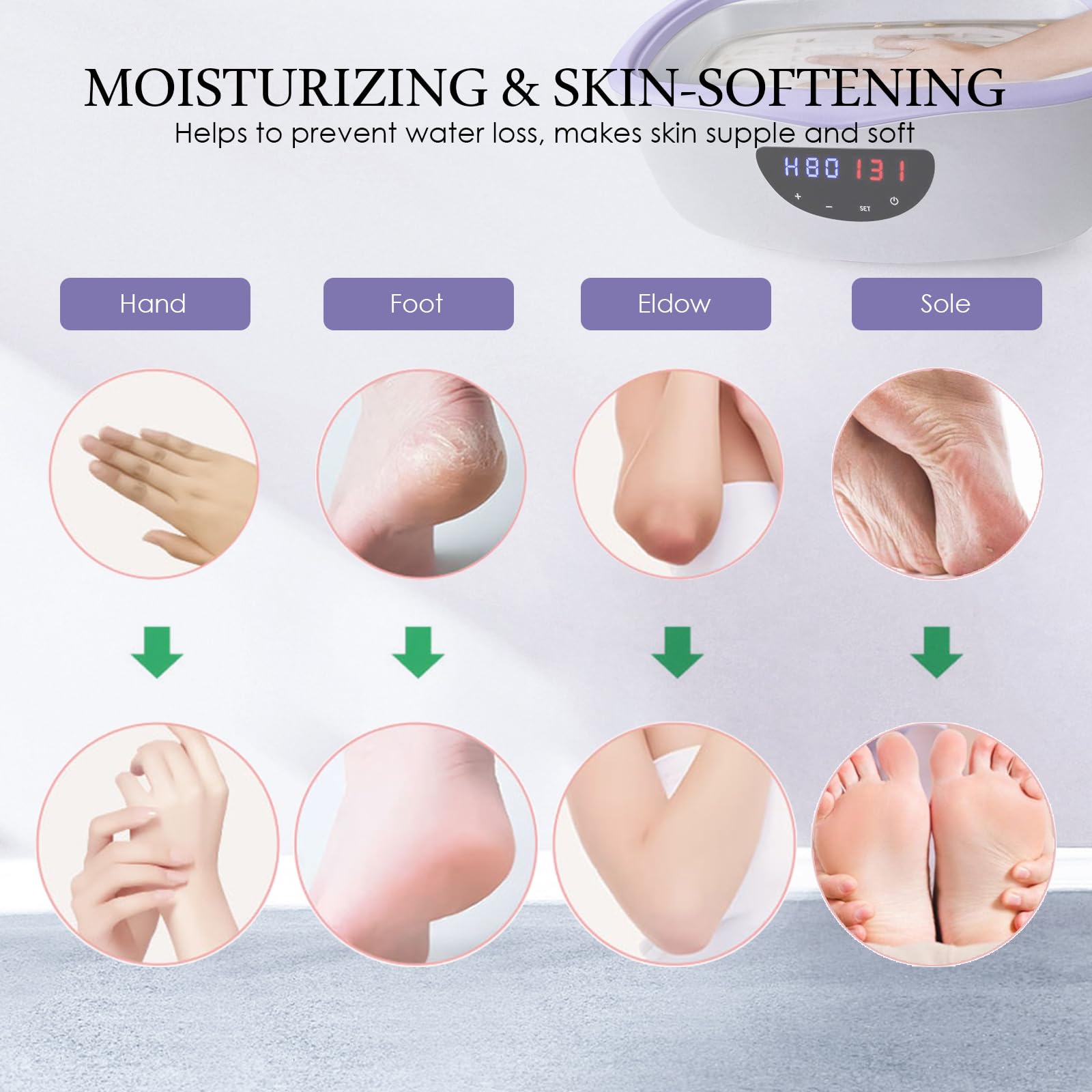 - Complete Paraffin Treatment: Hydrate and soothe your skin for a silky smooth and nourished feeling; dip hands, elbows, or feet into the spa for a hydrating wax bath that easily peels off for softer skin