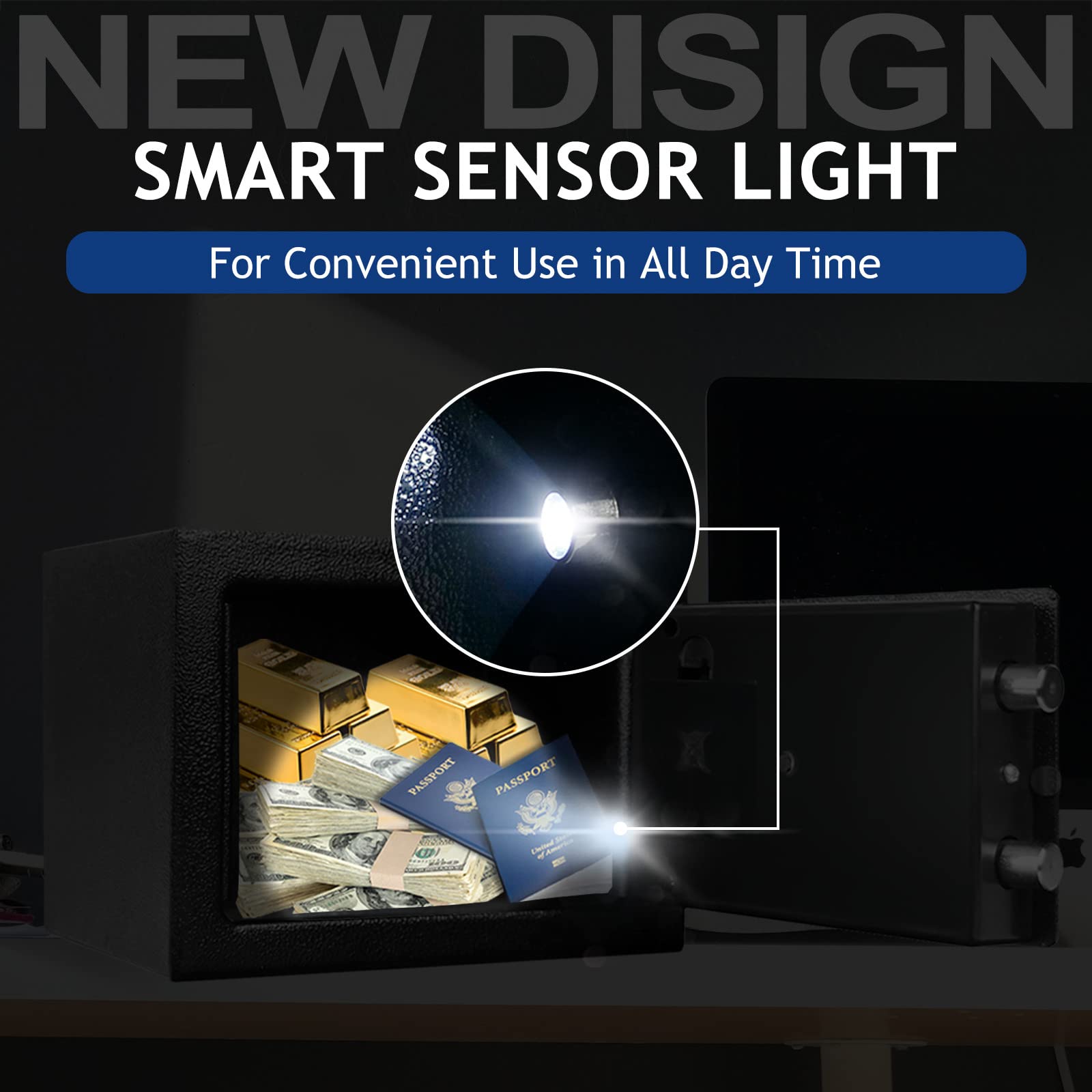 - [More Convenient - Intelligent Sensor Light]: Compared with other combination safe box for money, the NEWLY ADDED Sensor Light in our security box will automatically light up for 30 seconds when the door opened by pass code. This design enables you to find and take the valuables inside the fire safe, money lock box safe easily even in the dark. In addition, indicator light of the fire proof safe box for home safe will remind you battery is about to run out by lighting up a red light.