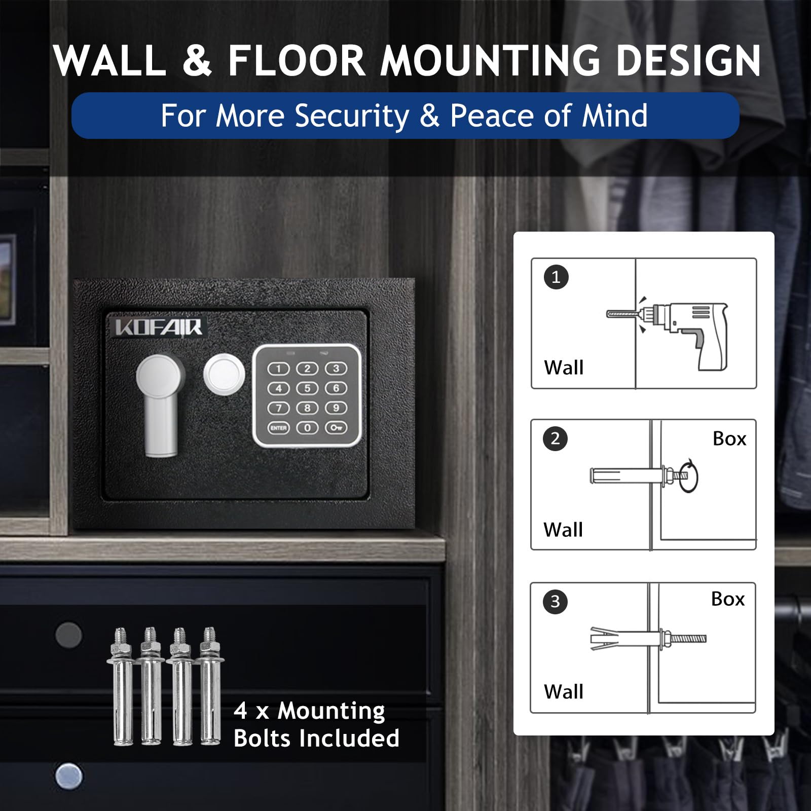 - [More Protection - Steel Safe Box + Fireproof Money Bag]: KOFAIR Safe Box with Upgraded Digital Keypad is designed to protect your small valuables, like passport, cards, jewelry, medicine, cash safe, money safe. With the EXTRA Fireproof Money Bag, and REINFORCED Solid Steel Safe, our fireproof safe lock box set provides MORE FIRE PROTECTION than other small safes for home. Suitable for EMERGENCY PREPARATION, and protect your valuables from fire, hurricane and earthquake, etc.