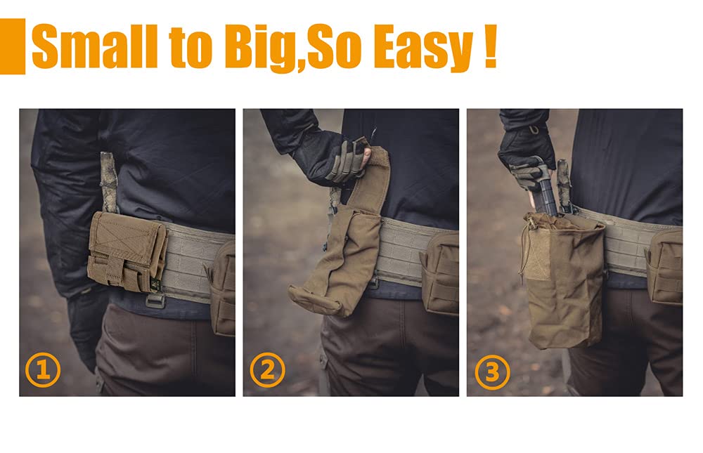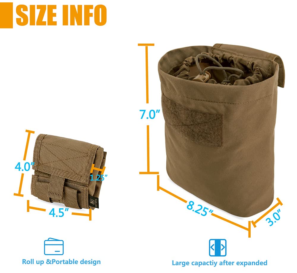 - The folding dump pouch is compatible with MOLLE or pistol belts up to 2.5 inches in height.