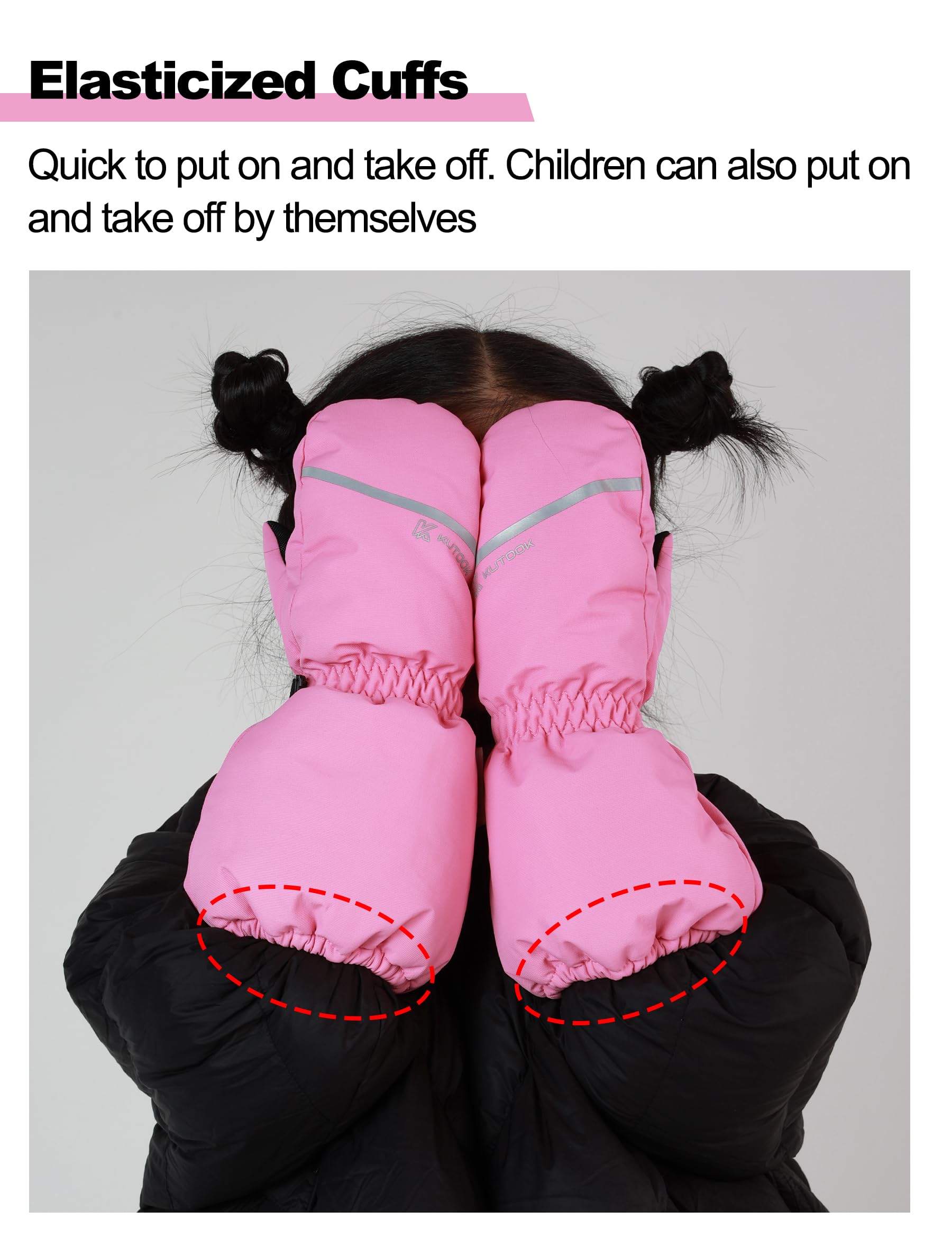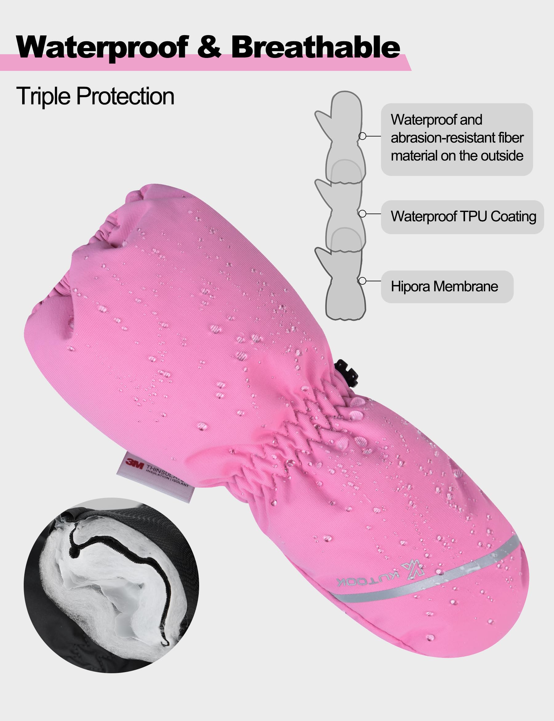 - đ„ ăWarm cottonă--- KUTOOK Kids ski mittens Made of 3M thinsulate and taslon materials for warmth and waterproof; Warm lining with warp knitted fabric ensures that your child can play outdoors and enjoy the winter.