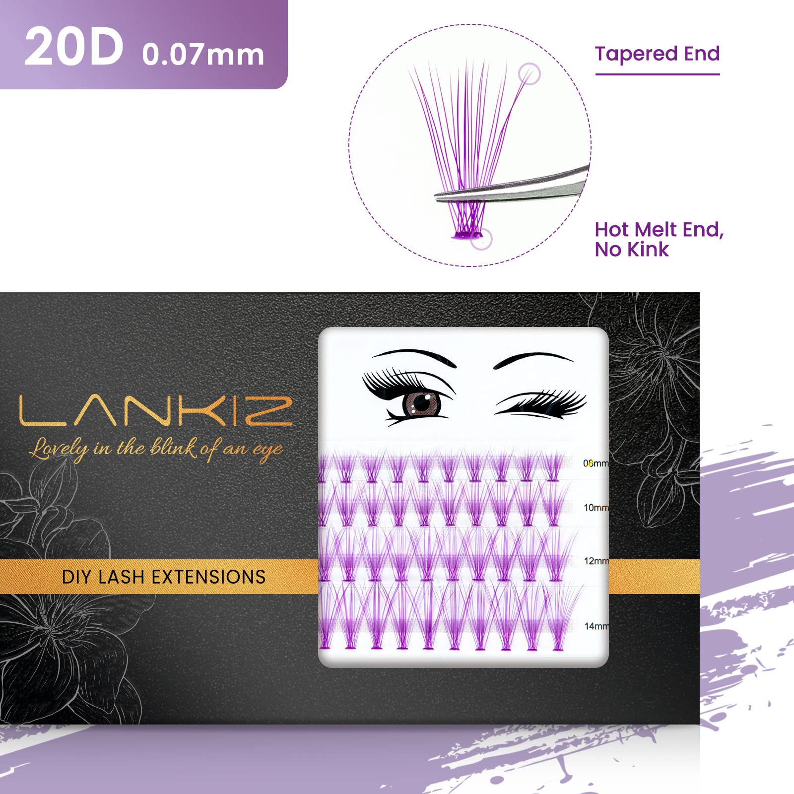 LANKIZ DIY Lash Extensions, 20D Purple Colored Individual Lashes, Flat-band Cluster Lashes for Eyelash Extensions, 0.07 mm 8-14mm Mix Faux Mink False Eyelashes for Home & Salon Use