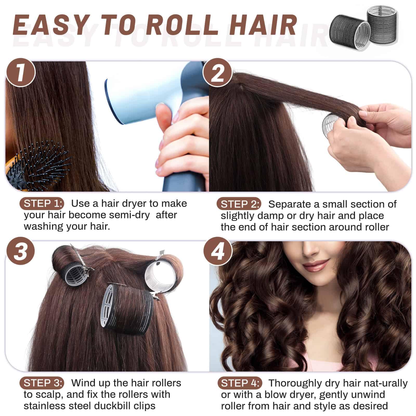 - Easy to Use: Use a comb gently brush a section of 70%-90% dry hair, put the hair curlers in the hair end, and roll up towards your scalp, then secure the hair rollers with clips, use a blower to dry your hair, then you can get charming curly hair. These large hair rollers are very easy to put in and take out, no other tools are needed, and save your hair from heat or chemical damage