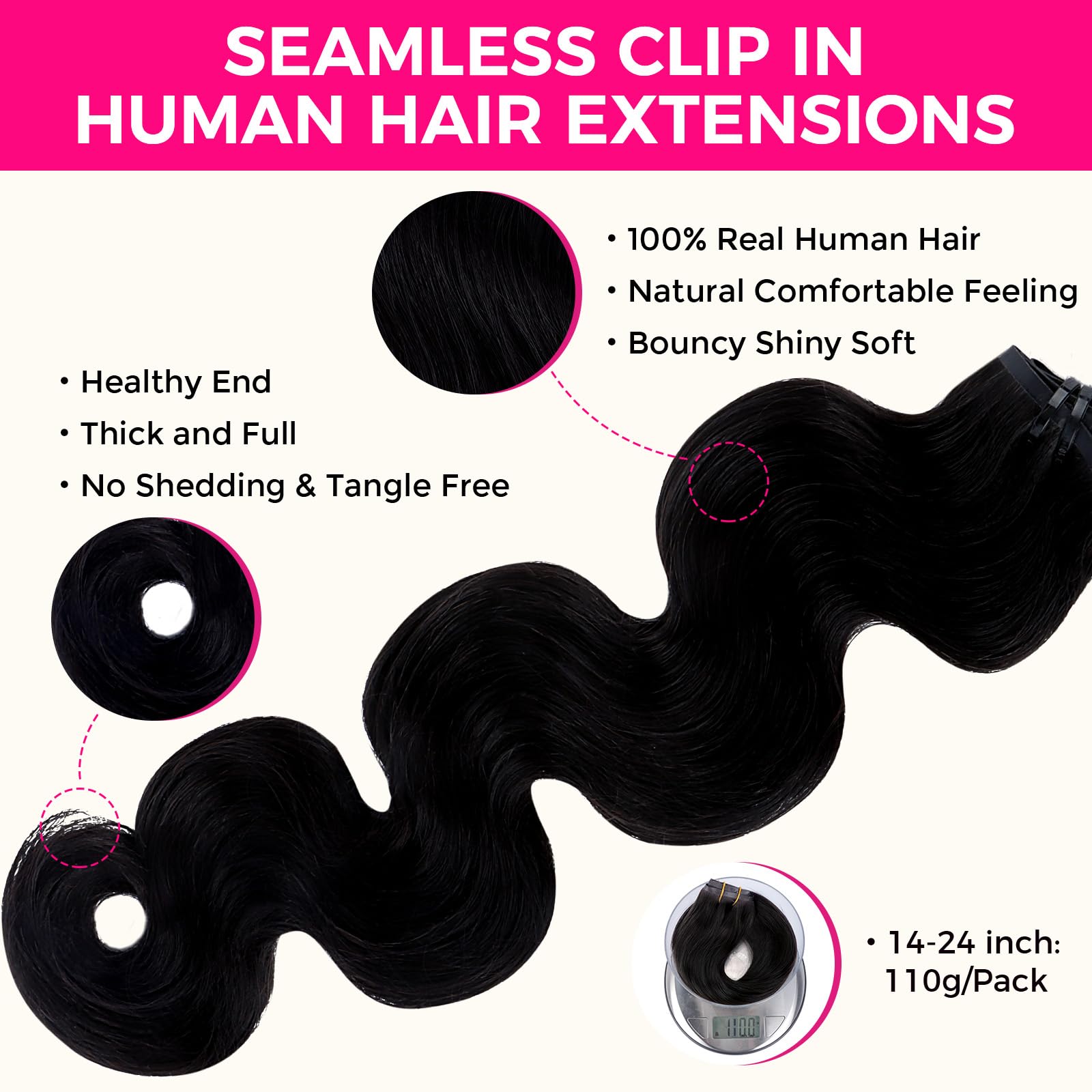 Lashey Seamless Clip in Hair Extensions Human Hair #1 Jet Black Body Wave Clip in Hair Extensions Real Human Hair 7pcs 110g 14 Inch PU Weft Natural Hair Extensions for Women