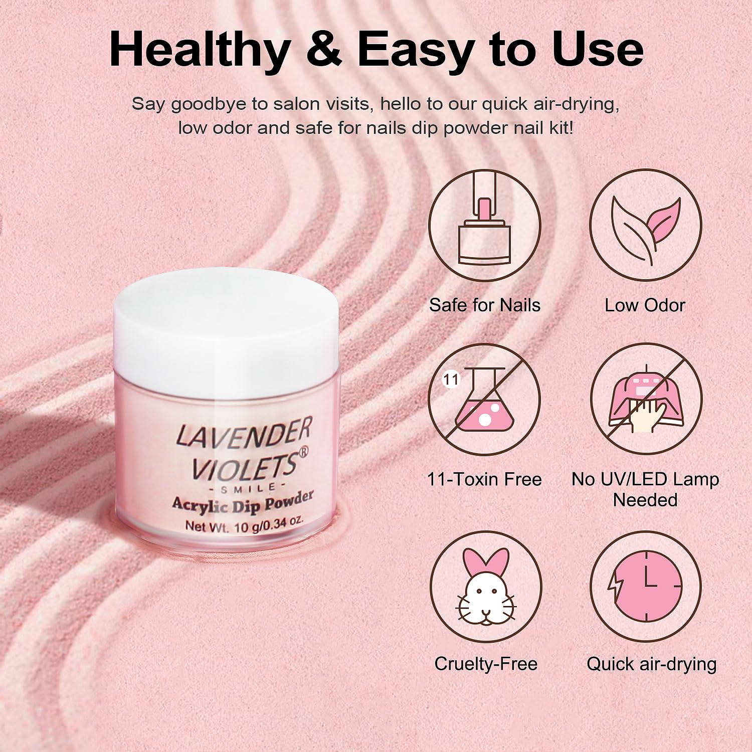 - Premium Quality: Lavender Violets dip powder system is made of high-quality raw materials, this nail dip powder made of 11 Toxin-Free ingredients, features safety requirements, low odor, no harsh ingredients or adhesives. These chip-proof and smudge-proof are safe on natural nails, the top alternative to gel nail polish.