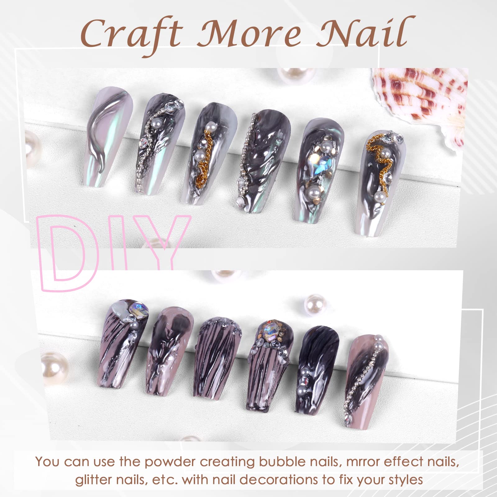- Wide Application: The nail chrome powder is suitable to be applied on UV gel nails, acrylic extension and natural nails. It can also perfectly match with chameleon flakes, nail charms, bubble effect, water ripple pattern, French manicure, 3D shell nails and etc. Just unleash your creativity.
