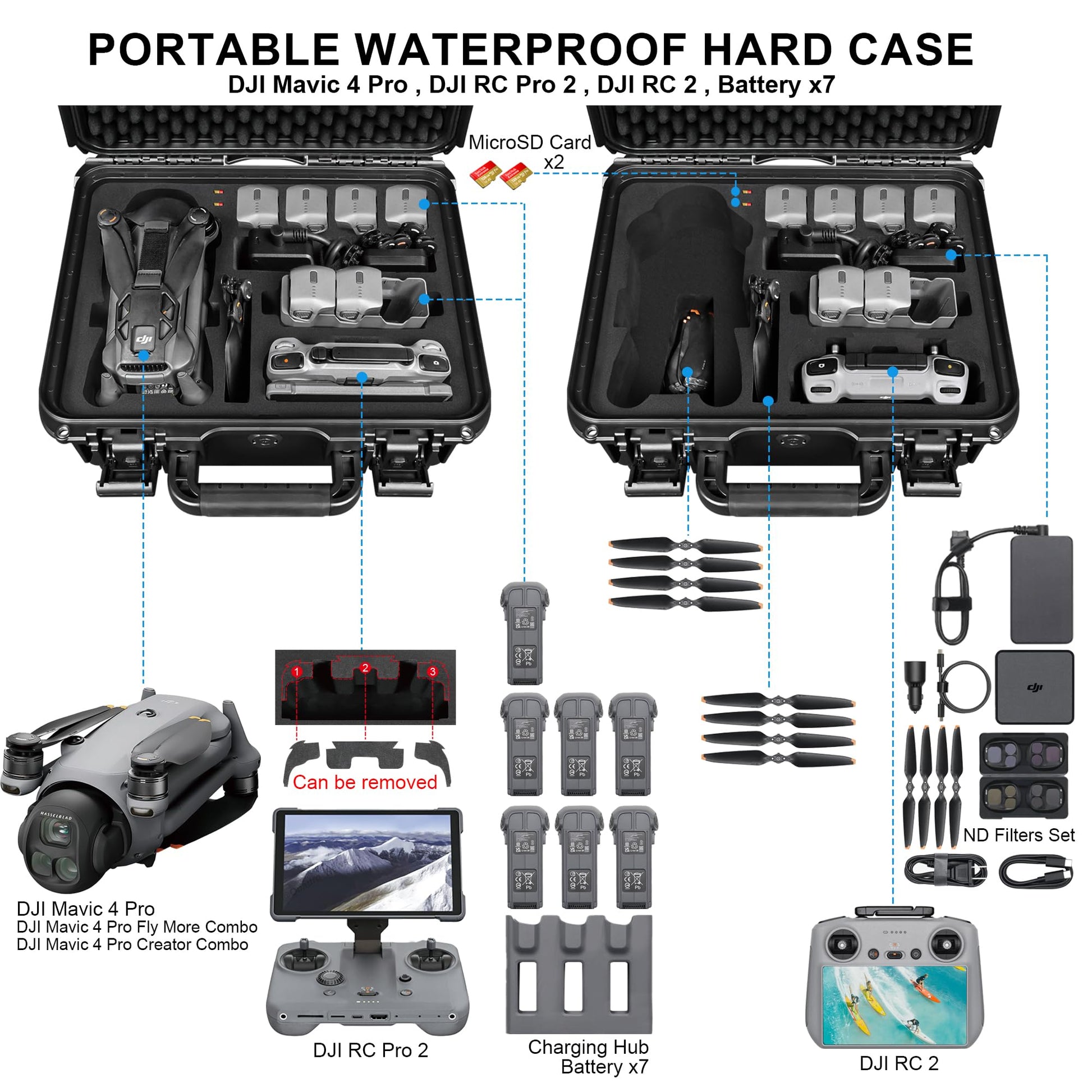 - Large Capacity: 1x DJI Mavic 4 Pro Drone, 8x DJI Mavic 4 Pro Battery (Include Drone Inner Battery), 1x DJI RC Pro 2 Remote Controller or DJI RC 2 Remote Controller, Charging Hub, 1x DJI 245W Charger,DJI 100W Charger, 2x microSD Card, 4x Mavic 4 Propellers (Pair), ND Filters Set, Cables and More Mavic 4 Accessories.