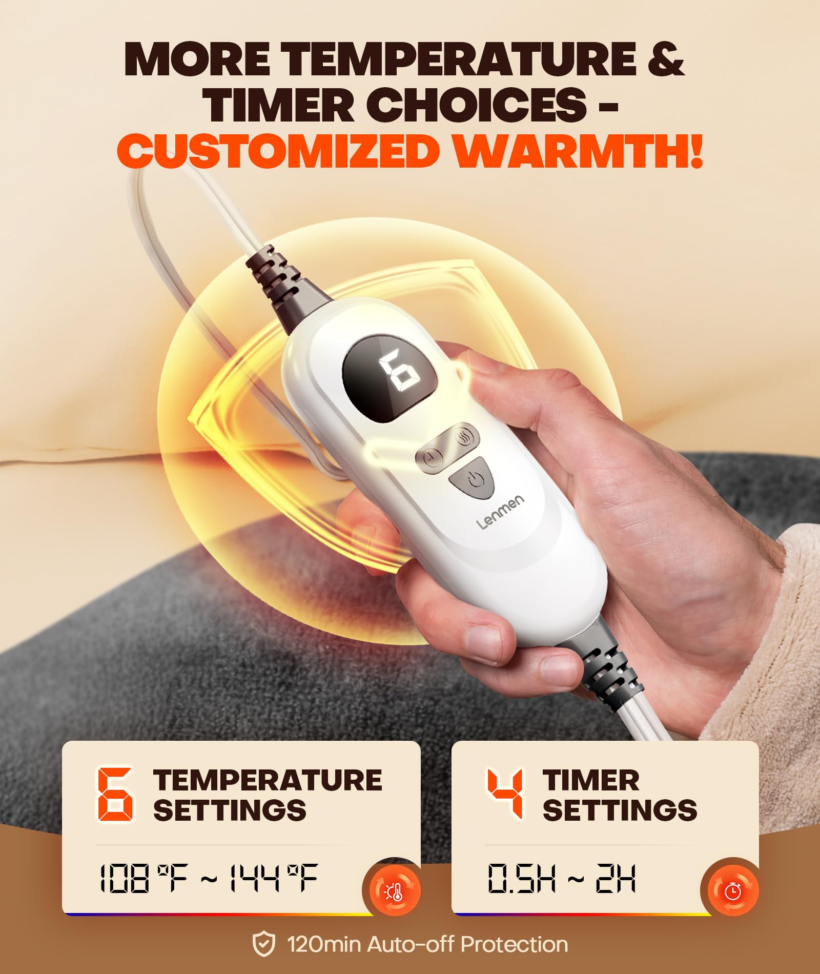 - MORE HEAT & TIMER CHOICES TO CUSTOMIZED WARMTH! To better accommodate your demands, this neck and shoulder heating pad features 6 temperature settings(108℉ ~ 144℉) and 4 auto-off timer options (0.5 h ~ 2 h). You can easily tailor your preferred warm mode with the LED controller. The neck heater is big enough to cater to most body shapes and sizes. The micro plush flannel fabric has a luxurious and soft feel and is machine-washable after removing the controller, cleaning will be a breeze!