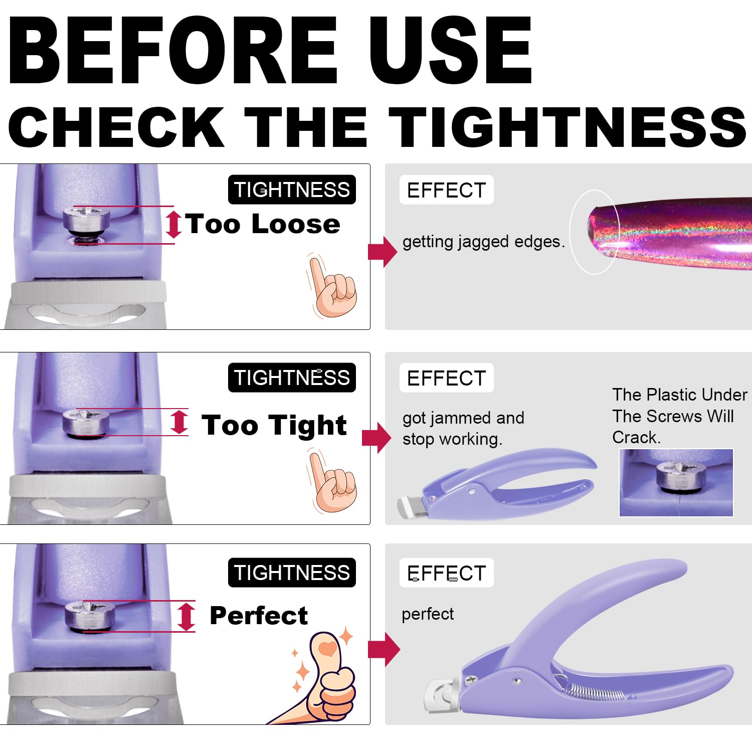 ✂️Sharp Blade and Smooth Nails -- Cut acrylic nails quickly and smoothly with this sharp-blade and strong-springe clipper. The comfortable handle and safe edge design make cutting nail tips a breeze. Please check the tightness of the screw before use, perfect tightness will make sure you clipper work well.