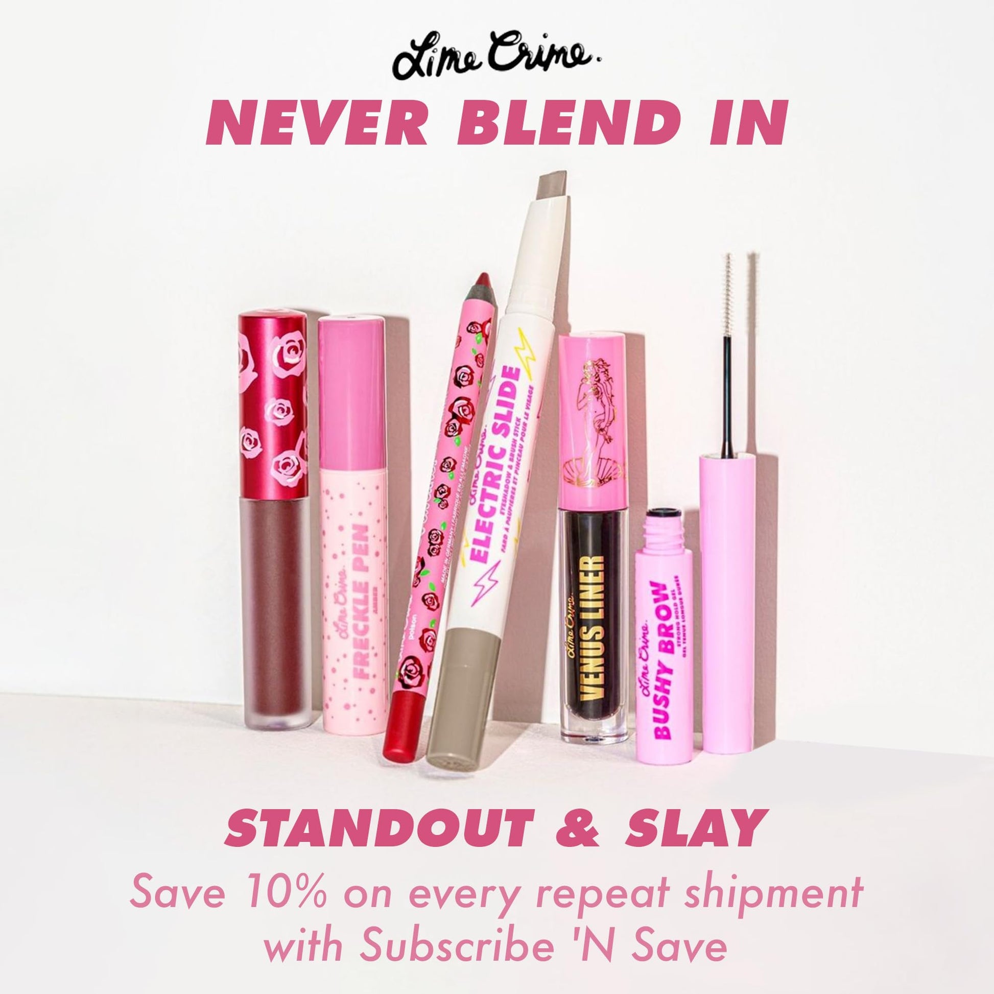 - Never Blend In: Lime Crime is a Vegan & Cruelty-Free makeup and hair brand that aims to inspire and invites self-expression. Through our vibrant color products, we encourage all to explore their individuality, embrace their uniqueness and always stand out from the crowd. Find joy through color and re-imagine your boundaries with Lime Crime.