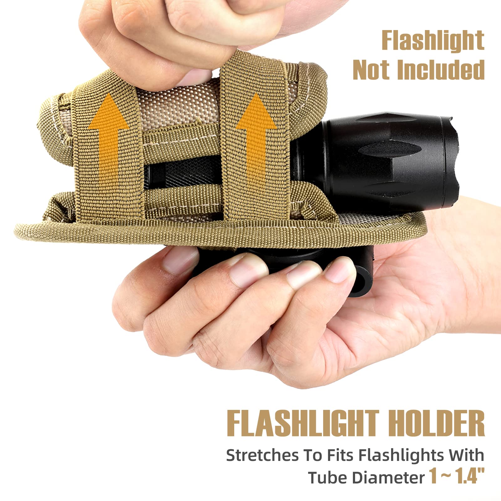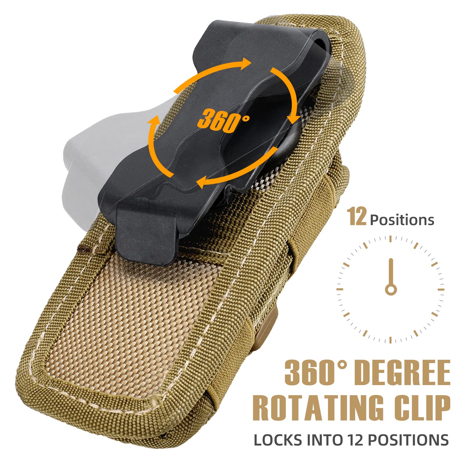 LIVANS Tactical Flashlight Pouch Holster, Rotatable Flashlight Holder Belt Clip Tactical Torch Carry Case with 360 Degree Carabiner Reel Clip Khaki