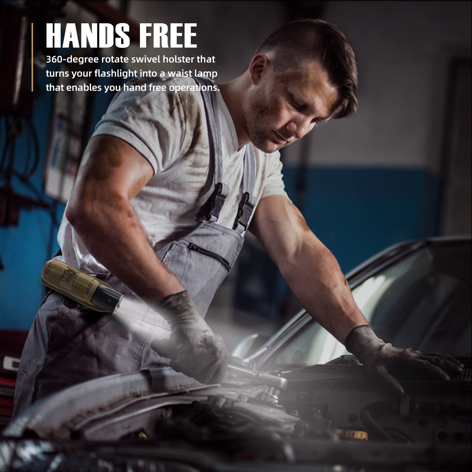- DURABLE ROTATING CLIP: Tactical torch pouch attach the ultra sturdy clip to your belt and allows your light to rotate 360° and lock in 12 different positions for aimable, hands-free lighting from the hip while you work.