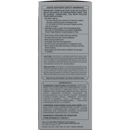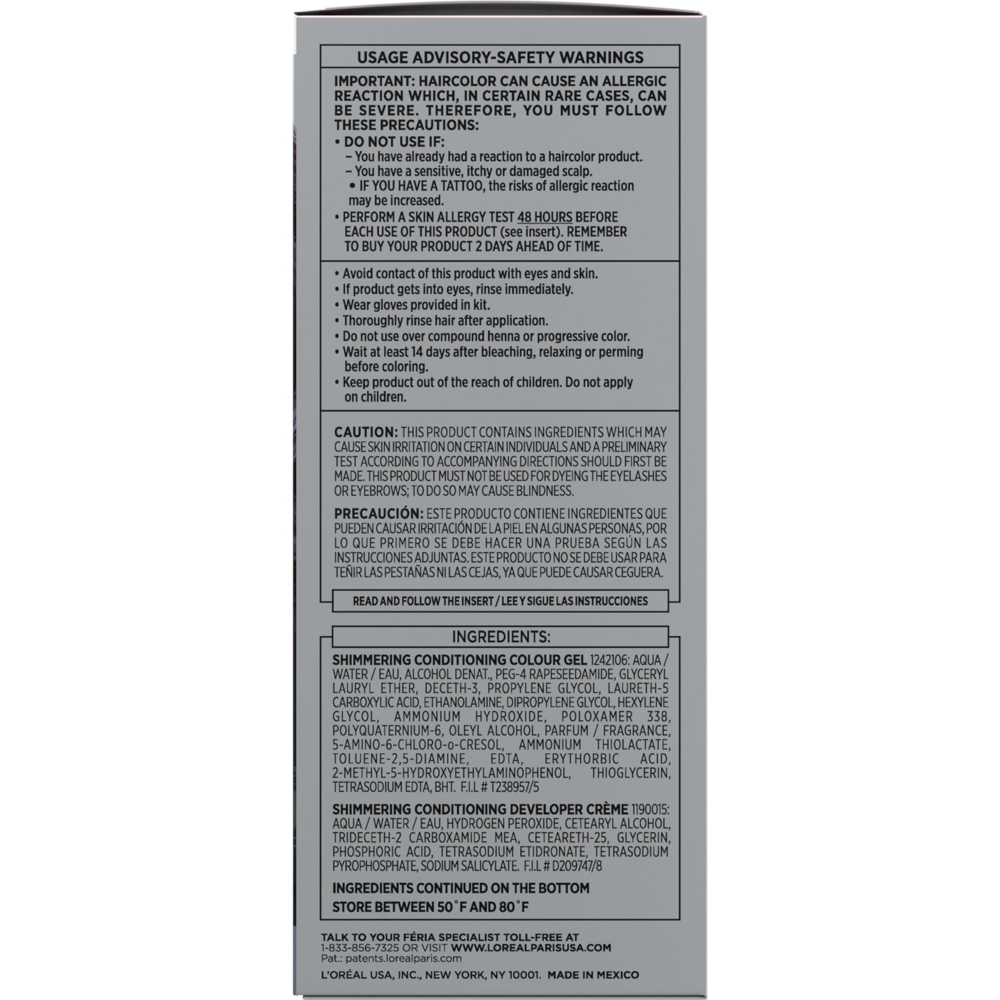 Details: With L'Oreal Feria, what you see is the shimmer. Multi-faceted shimmering color with 3x highlights delivers intensified, brilliant results. Inspired by fashion, Feria offers a twist on the traditional and gives edgy hair color - from bright red, platinum blonde, rose gold, metallic brown, to blue black hair color, these hair dye kits will transform your hair. Feria's prismatic color spectrum is custom-blended by L'Oreal master colorists for bold, head-turning shades - no appointment necessary. The Power Shimmer Conditioner seals and smooths. Won't wreck or ravage hair. Packaging may vary, what you receive may not be what is reflected on site.