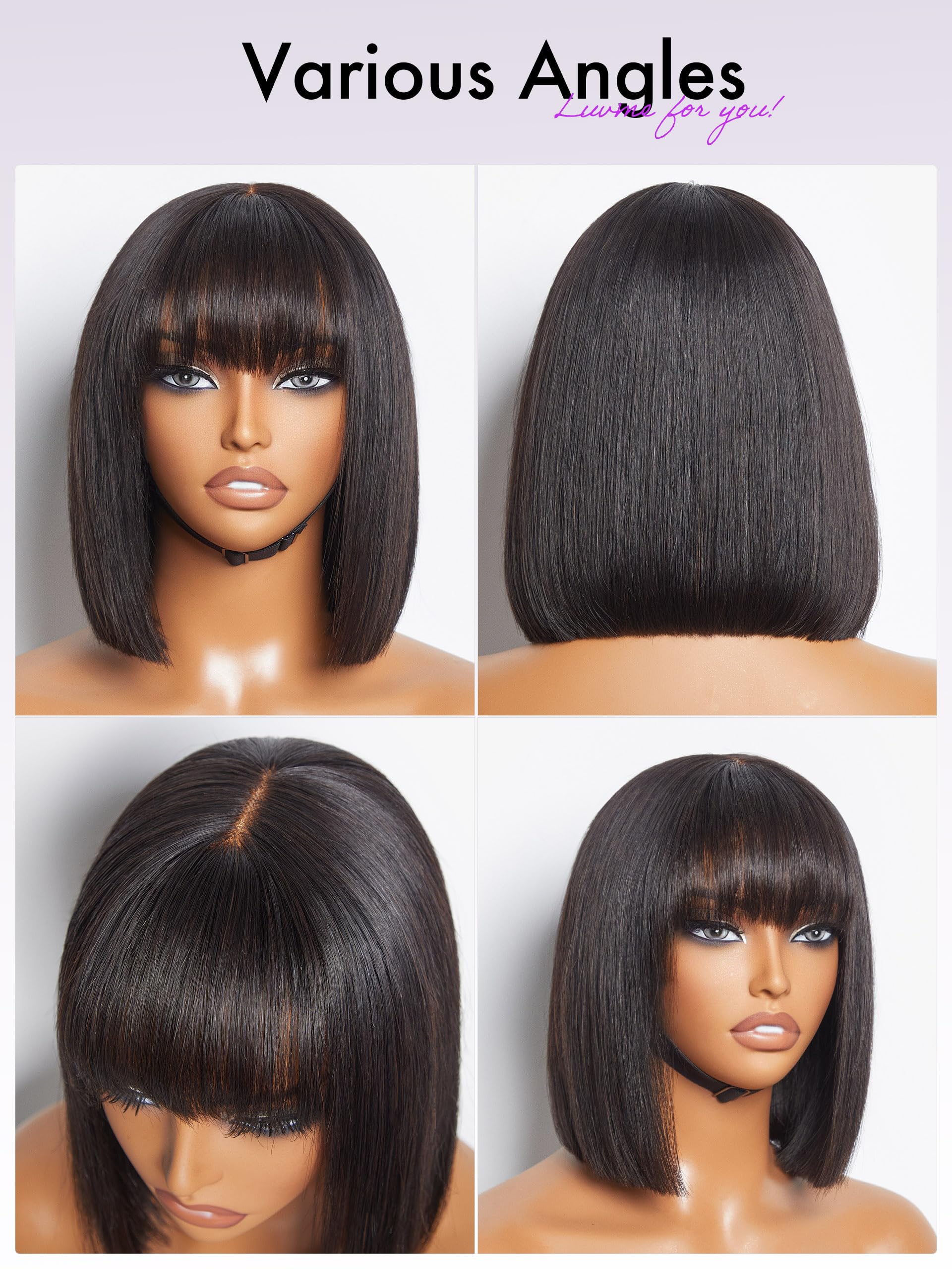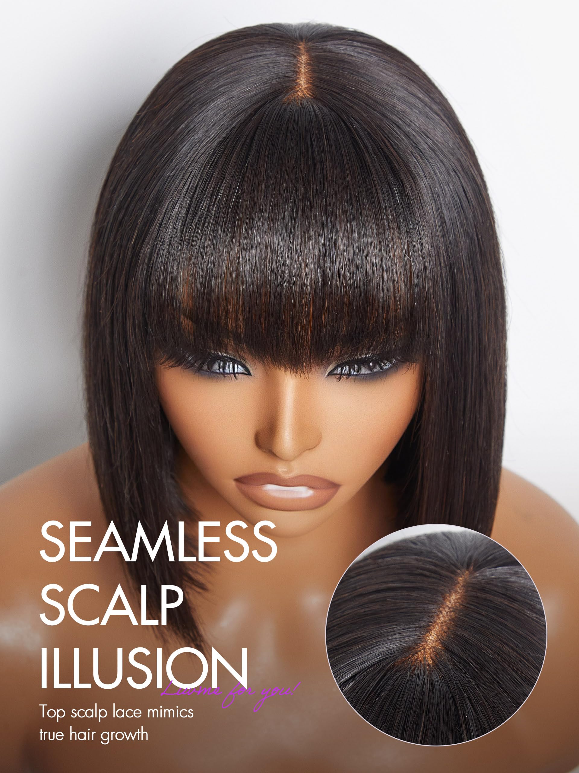LUVME HAIR 10 Inch Silky Straight Bob Wig with Bangs Human Hair Realistic HD Lace Short Black Bob Wigs, Ready to Go Blunt Cut Bob Wig Glueless 180 Density