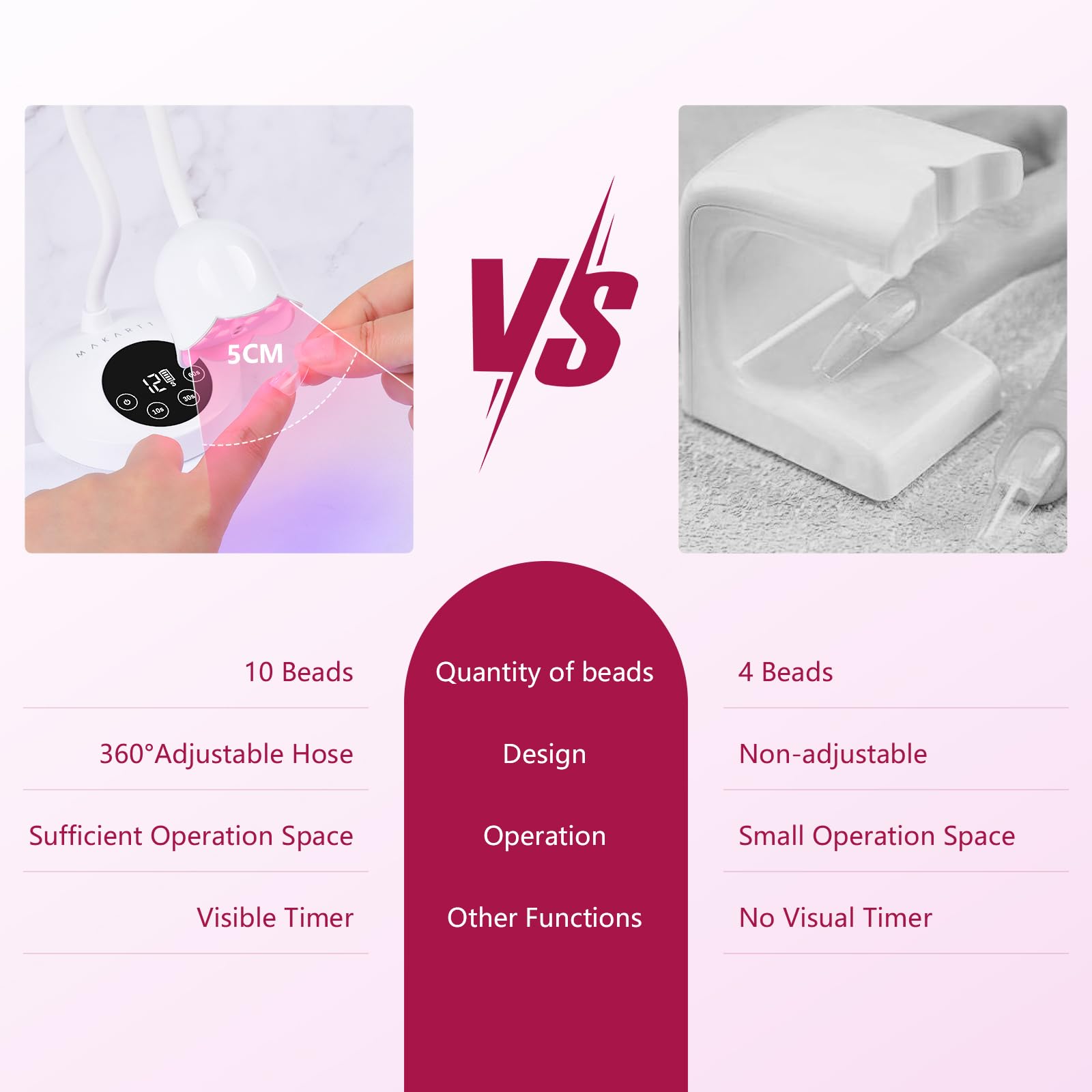 - Quick Drying & Efficiency: Makartt cordless nail lamp features with 1800mAh rechargeable built-in battery and 10pcs UV+LED dual light source beads to shorten curing time effectively and cure all kinds of manicure gel in 60s(Stay within 5cm). Different nail gels have different curing times, for example false nails(10s)、gel polish nails(60s)、extension gel nails nail (120s) and nail rhinestone glue(60s).