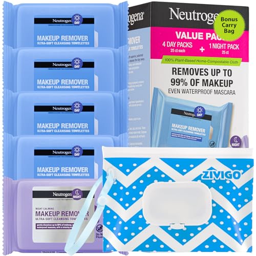 Makeup Remover Wipes, NeutrogeneDay & Night Calming Wipes Ultra-Soft Cleansing Facial Towelettes for Makeup, Alcohol-Free, Plant-Based, 125 Count (Pack of 5) With Travel Case, Great Gift Idea