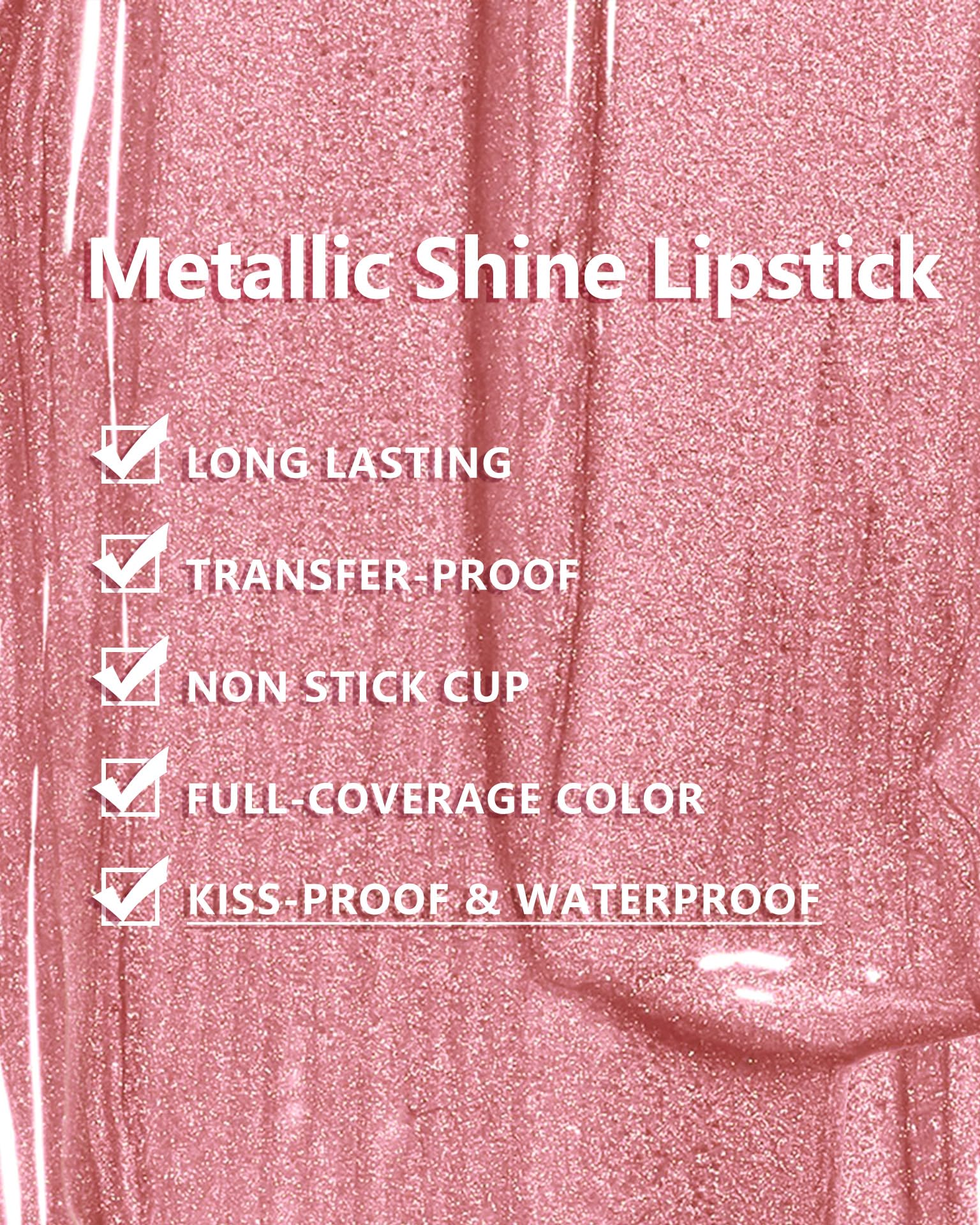 - Transfer proof & Long Lasting Lipstick: After it sets, this metallic lip gloss is ready to stay put. Get pro full-coverage color without worrying that your pearlescent lipstick will transfer to your coffee cup. Oil-based foods or lip toppers may affect the long wear.