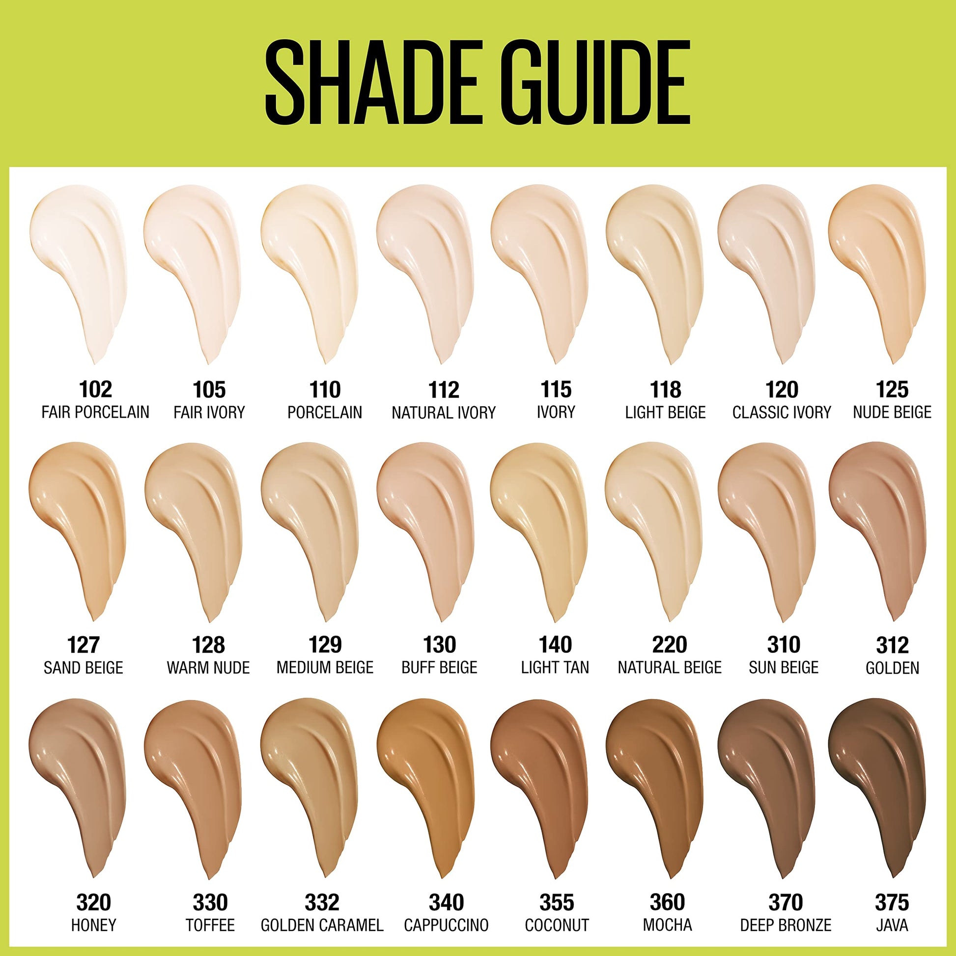 Details: Be your own professional makeup artist with Maybelline's full coverage 24H foundation. Saturated color pigments provide an ultra-transforming effect in this long-lasting foundation. The lightweight, yet high-impact coverage formula glides onto the skin for a flawless finish that lasts all day. Oil free. Doesn't clog pores. Dermatologist tested.