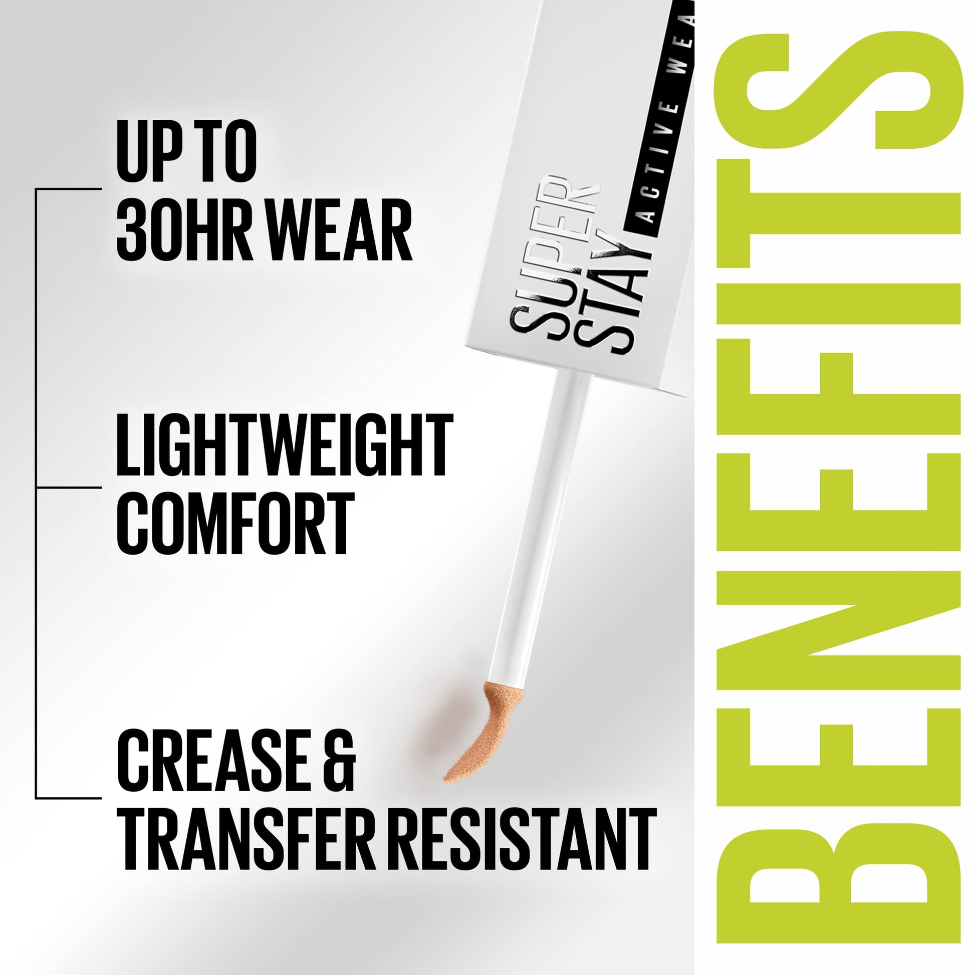 - Maybelline's Super Stay Active Wear Concealer delivers up to 30-hour wear and full coverage; This long lasting concealer wipes out dark circles and imperfections, giving you a comfortable, natural look