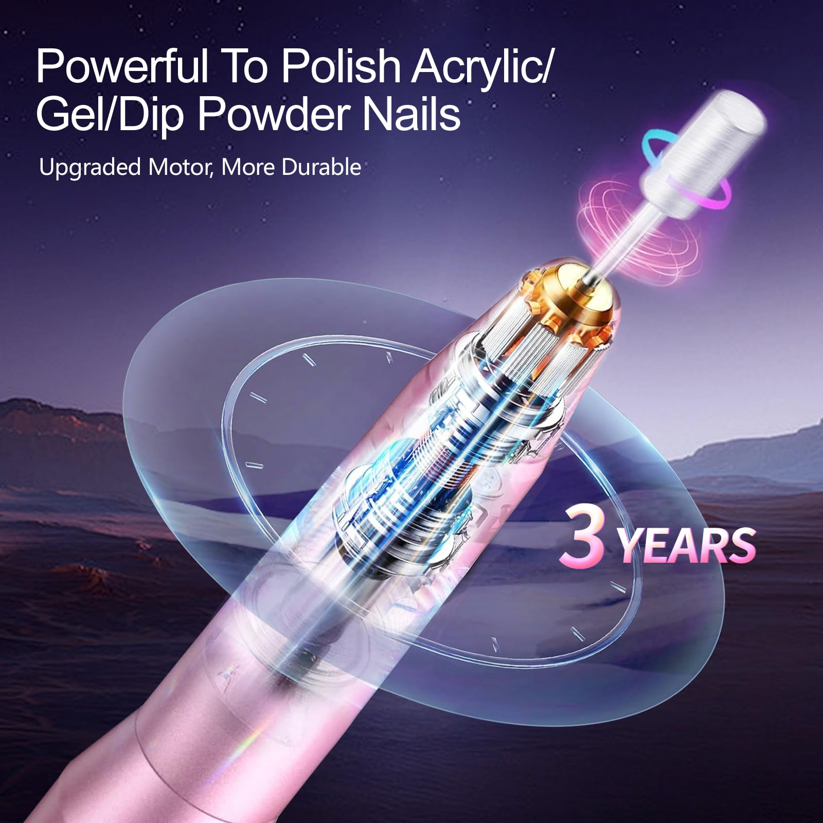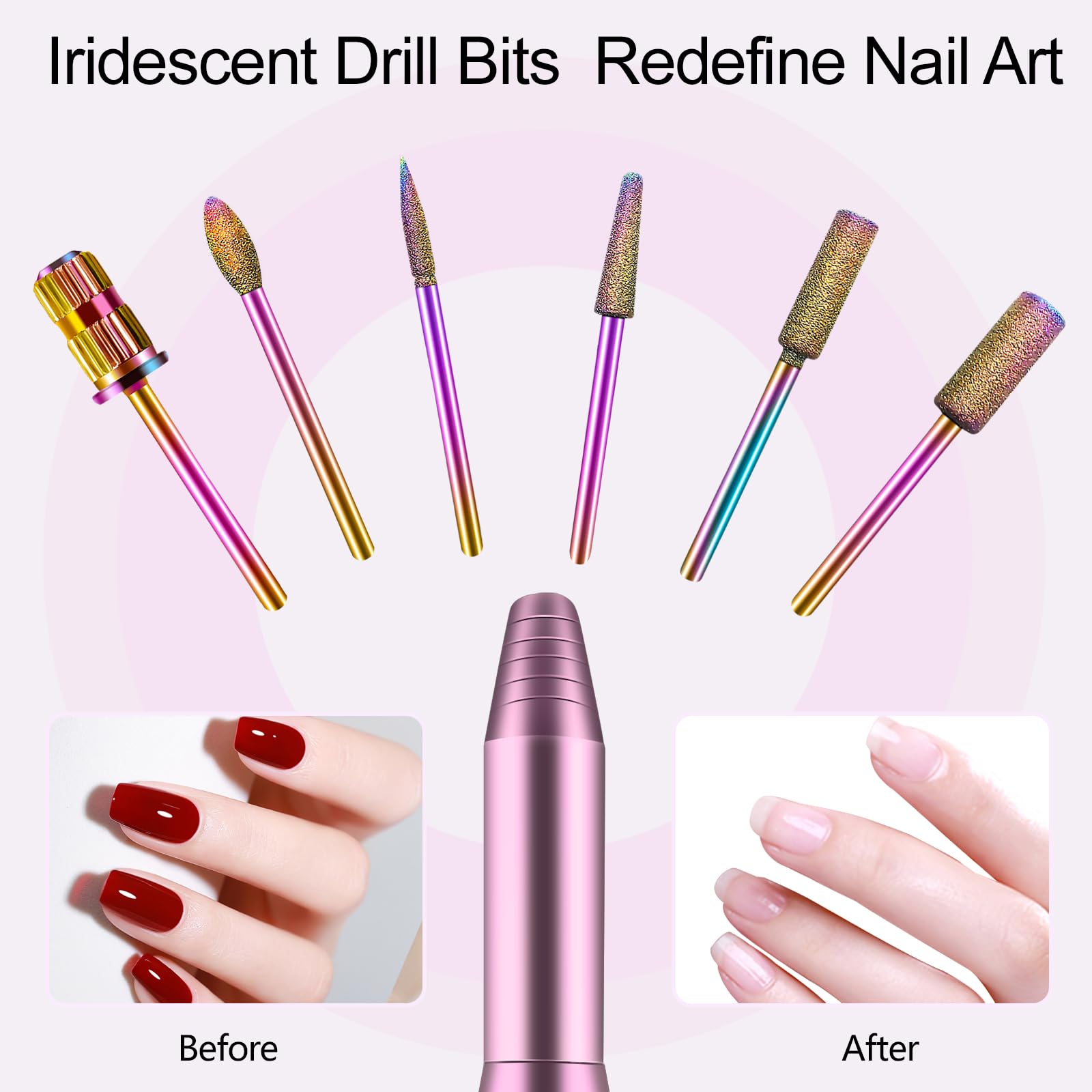 - 【Professional Nail Drill Kit】The nail drill kit include Professional acrylic nail drill machine, exquisite iridescent mandrel bit, 5pcs metal bits, 26pcs sanding bands and USB cord. It meets all your need for buffering, grinding, sharpening, sanding, polishing acrylic and gel nails, trimming thick natural toenails, and removing extension gels, cuticle and dead skin.