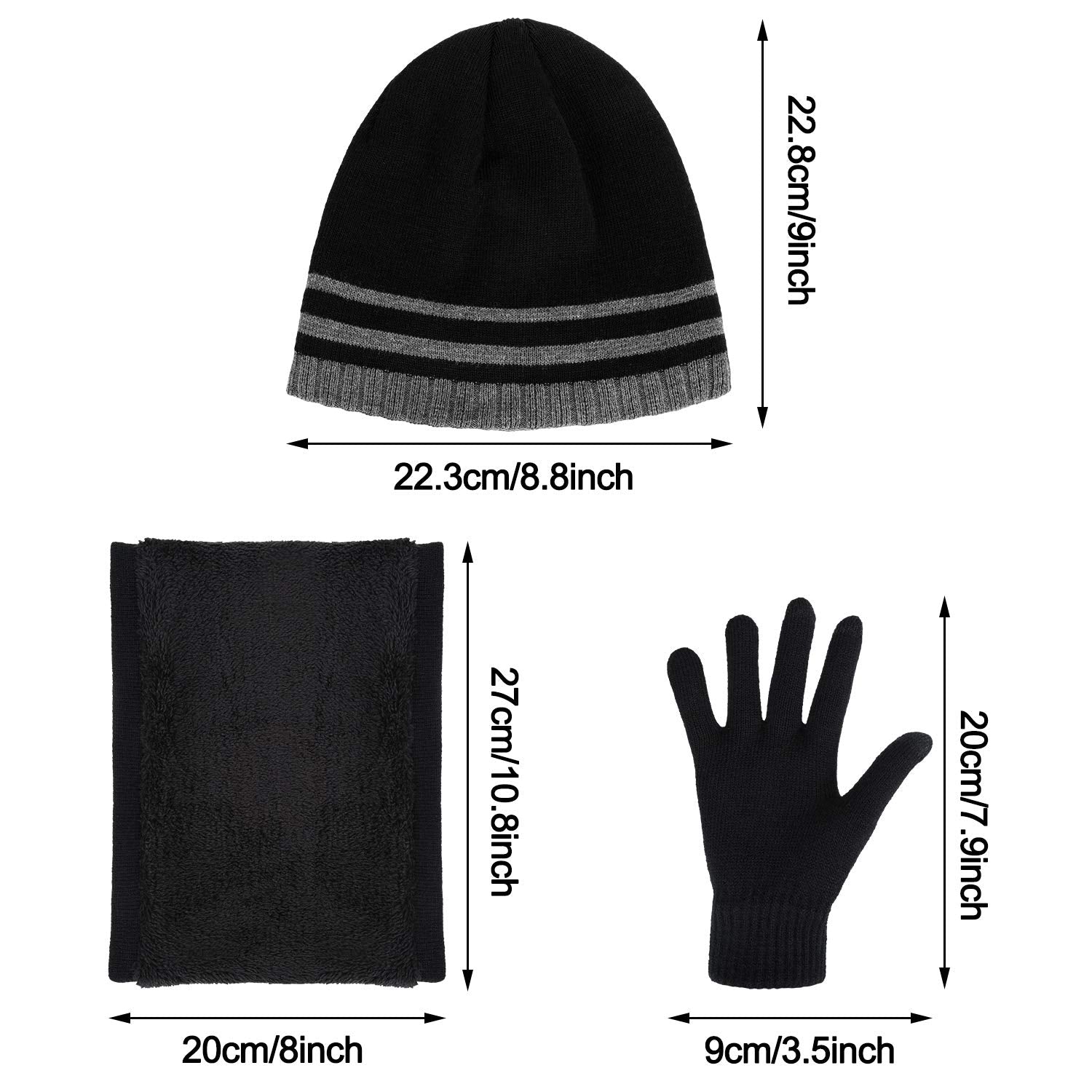 - Measurement: the beanie hat measures 9 x 8.8 inches; The scarf is about 27 cm/ 10.8 inches in length, 20 cm/ 8 inches in width; The gloves each measures 20 cm/ 7.9 inches in total length, and its width is 9 cm/ 3.5 inches, the middle finger length is 7 cm/ 2.8 inches, one size fits most