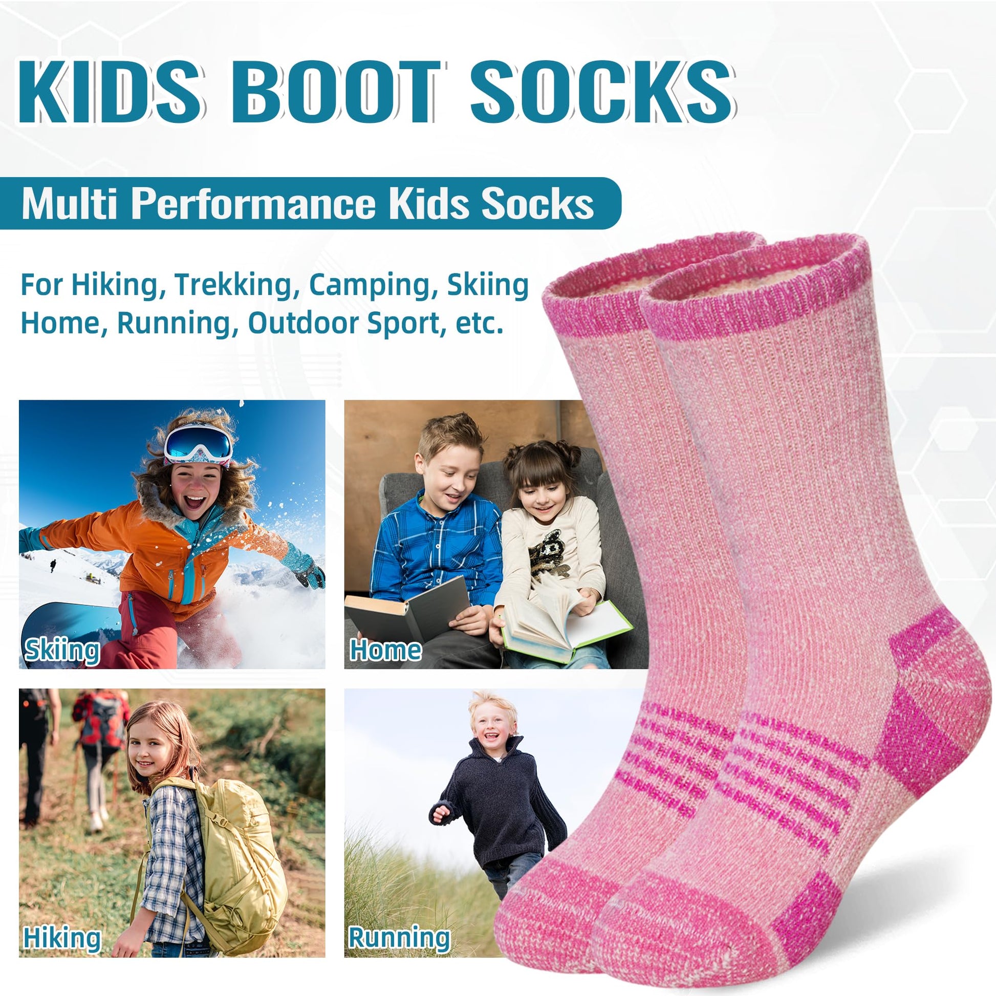 - 【STRETCHY & BREATHABLE】 These thermal hiking socks made of high stretchy fabric with moderately compressed, helps to stably fit skin, good air permeability, keep your kid's feets dry during winter actives, like skiing, hiking, running , outdoor playing, sport or everyday wear.