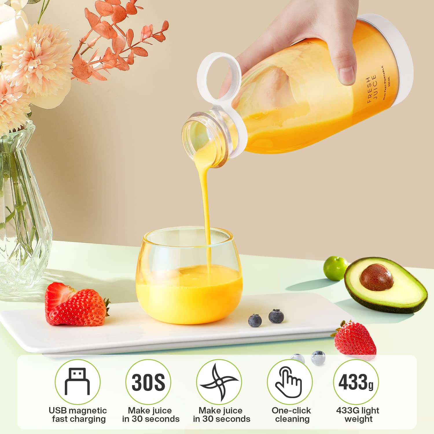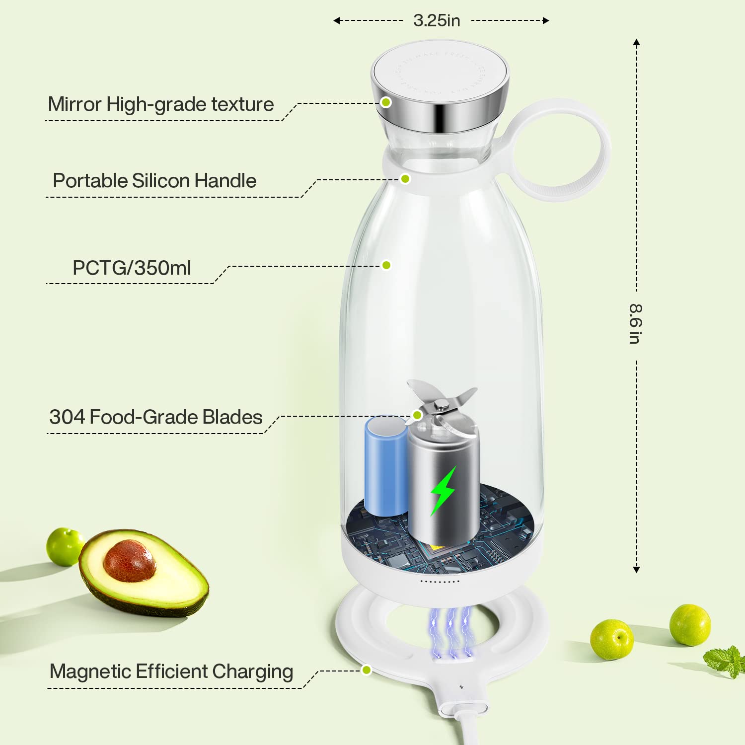 - 🍇USB Magnetic Wireless Charging: more convenient and simple charging method.blender portable Built-in 1400mAh rechargeable battery, easy charging by power bank, laptop, computer, mobile phone or other USB device. charging time is 3-5 hours; A full charge produces 10-15 cups of juice, and the size makes it the perfect blender for home, office, or travel.