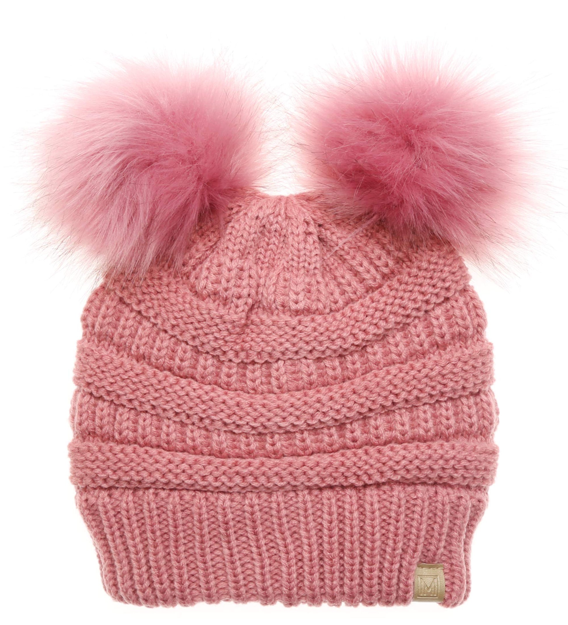 MIRMARU Kids Boys & Girls Winter Soft Warm Knitted Beanie Hat with Faux Fur Pom Pom for Ages 7-12 (Double Pom - Dusty Pink)