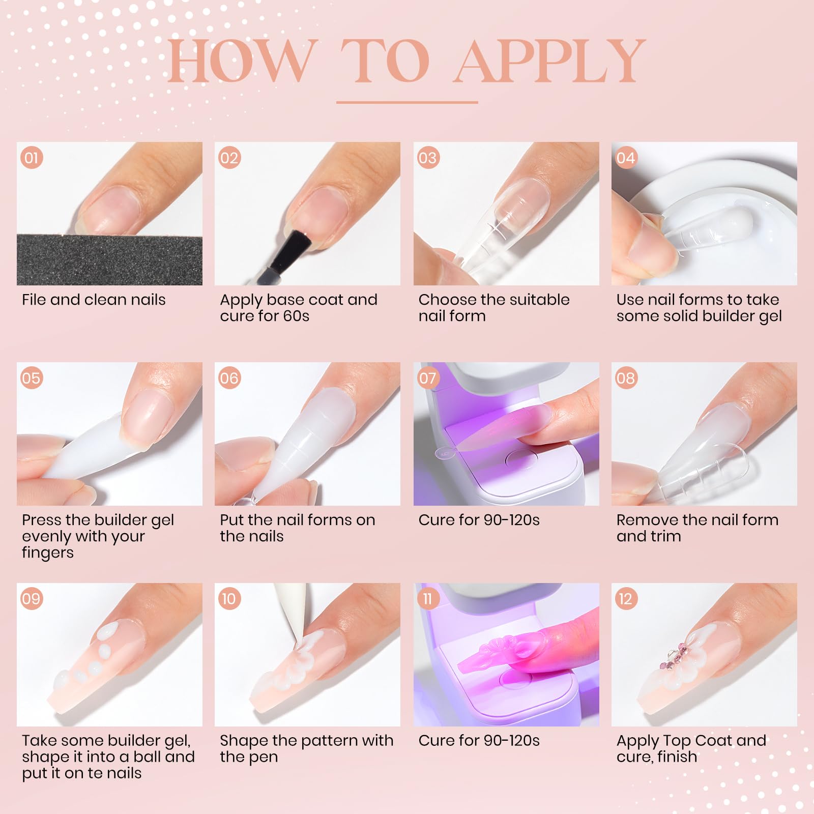 - Quick Extension & Funny 3D Nail Art: Enhanced Beautiful Nails in 3 Easy Step: Take gel with nail form, spread evenly, and cure. It's easy to do 3D nails, take the hard gel for nails shape it into a ball and place it on the nail surface, then shape the pattern with the sculpting pen, decorate it, and finish. Required base top coat, and need to cure under nail lamp