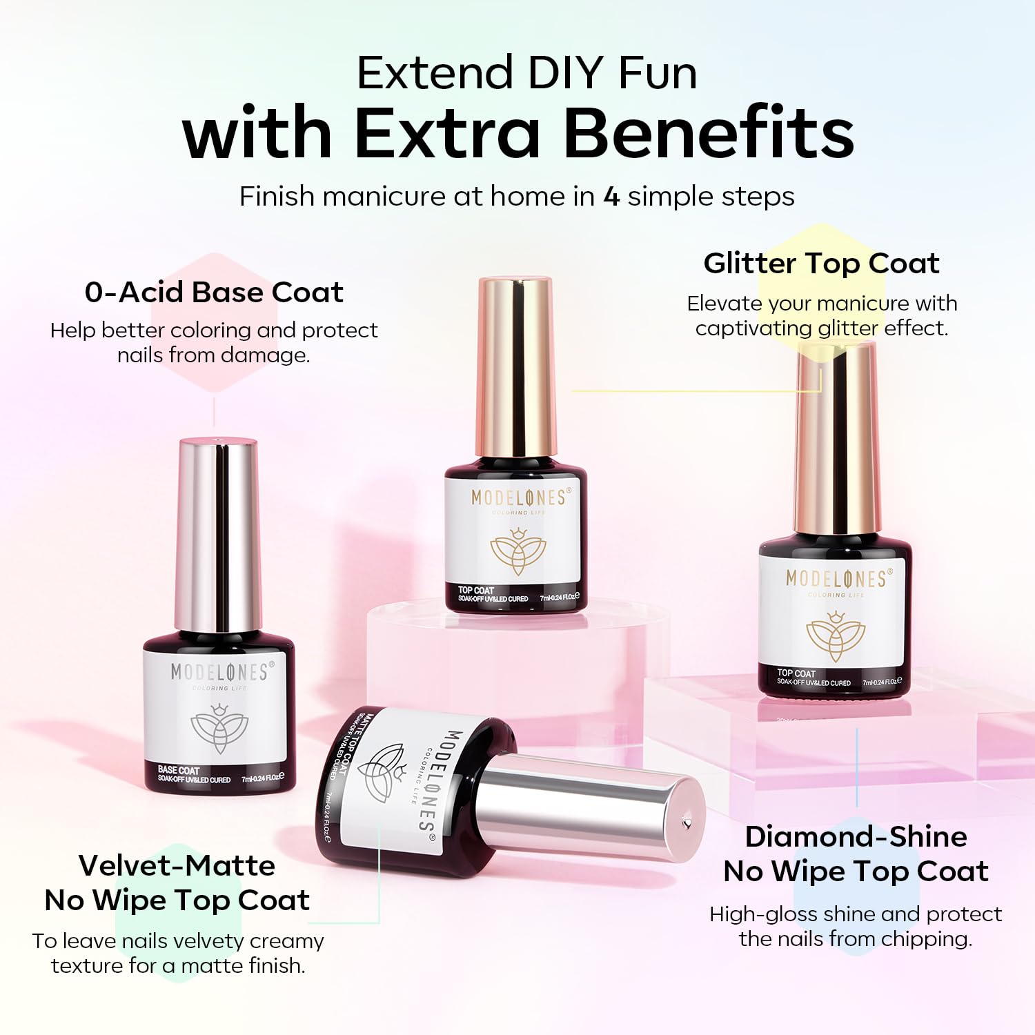 - 2025 Gel Nail Polish Set: Modelones Gel Polish Set offers a stunning range of 28 colors (7 ml/bottle) and No Wipe Base, Glitter & Glossy & Matte Top Coat. This gel nail polish set is perfect for spring/summer, following the latest gel nail color trends