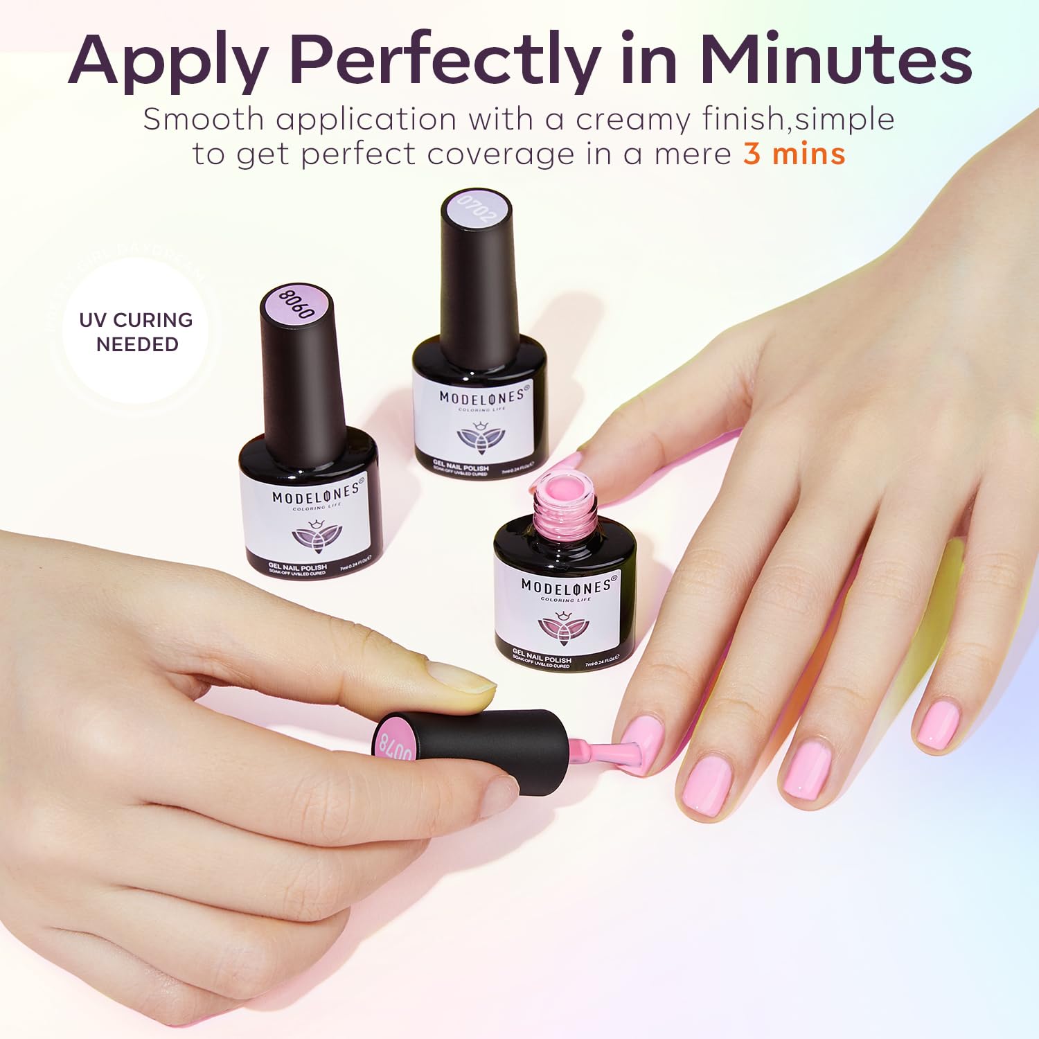 - 28 Days Long-Lasting: With durability of up to 28 days, Modelones matte nail polish gel set offers salon-quality results. Simply apply a base coat, gel color coat, gel top coat, use Modelones nail lamp for a quick 30-90 seconds proper curing process, and enjoy your stunning nails for nearly a month without worrying about chipping or fading