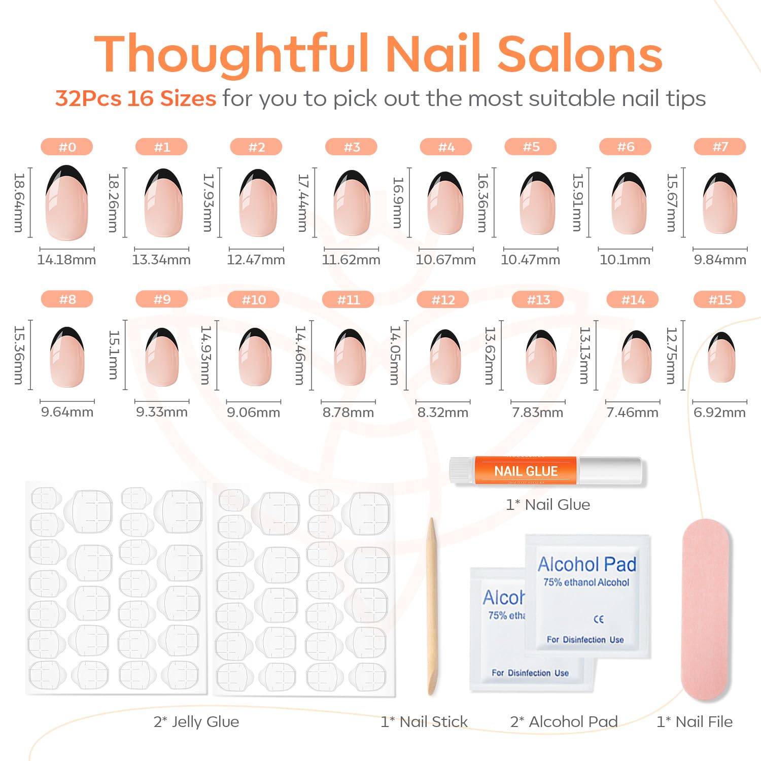 - 【What you will get】This Full Cover glue on nails set comes with 32 pcs reusable false nails in 16 different sizes to suit each finger, along with 2 sheets of nail adhesive taps for convenience, 1 pc nail glue for durability, 1 mini nail file and 1 cuticle stick for flawless application, and 2 prep pads for clean nails