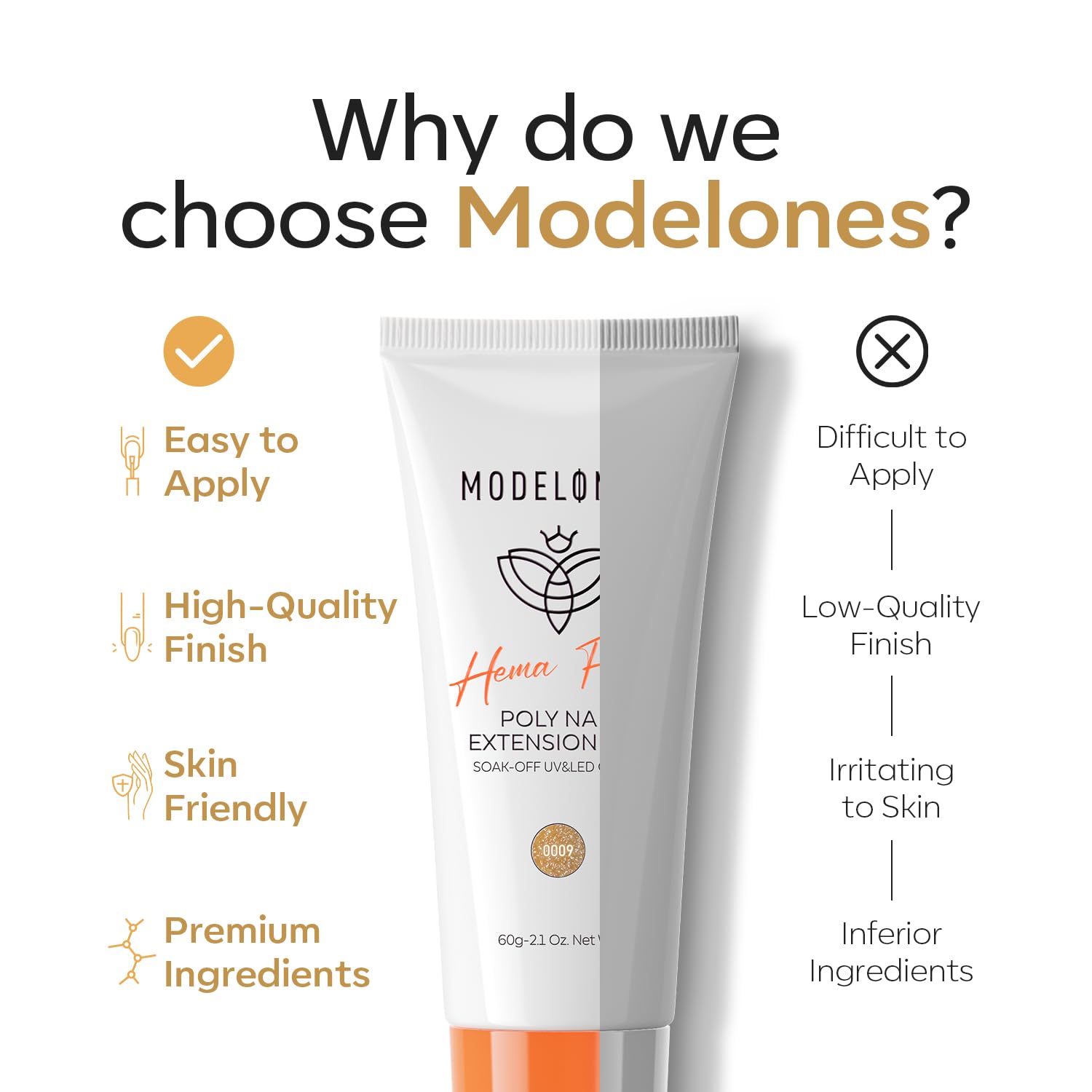 - 【Upgrade Mild Formula】 Modelones HEMA-FREE poly nail gel is designed to minimize the risk of allergic reactions, making it ideal for sensitive skin and for clients prone to nail product allergies. Please note: HEMA is NOT the only ingredient that can cause allergies. If discomfort or allergy occurs, please stop using it immediately. Take a skin test for 24 hours before use is still necessary
