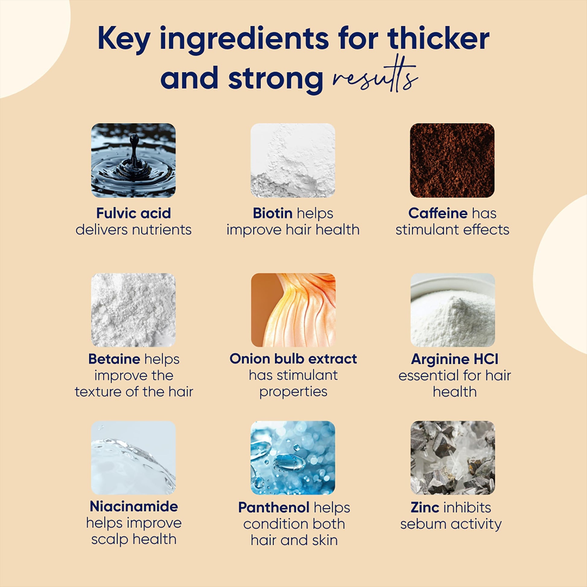 - 77 Minerals, 18 Proteins, 5 Vitamins: Each ingredient in our hair thickening spray has a special purpose; Caffeine blocks DHT; Fulvic acid helps funnel nutrients to each individual follicle; Biotin boosts keratin production to strengthen and lengthen hair – and that’s only the beginning